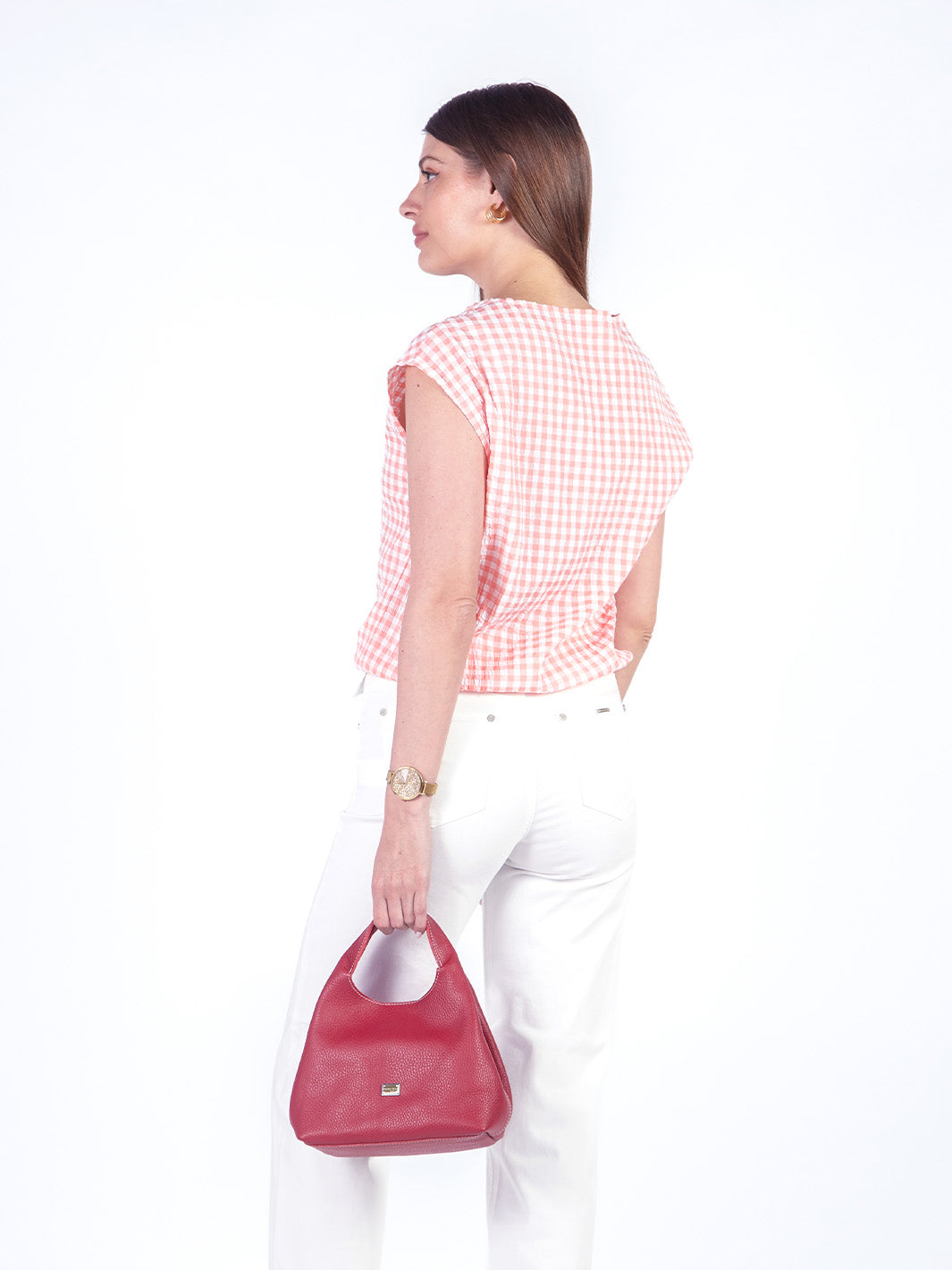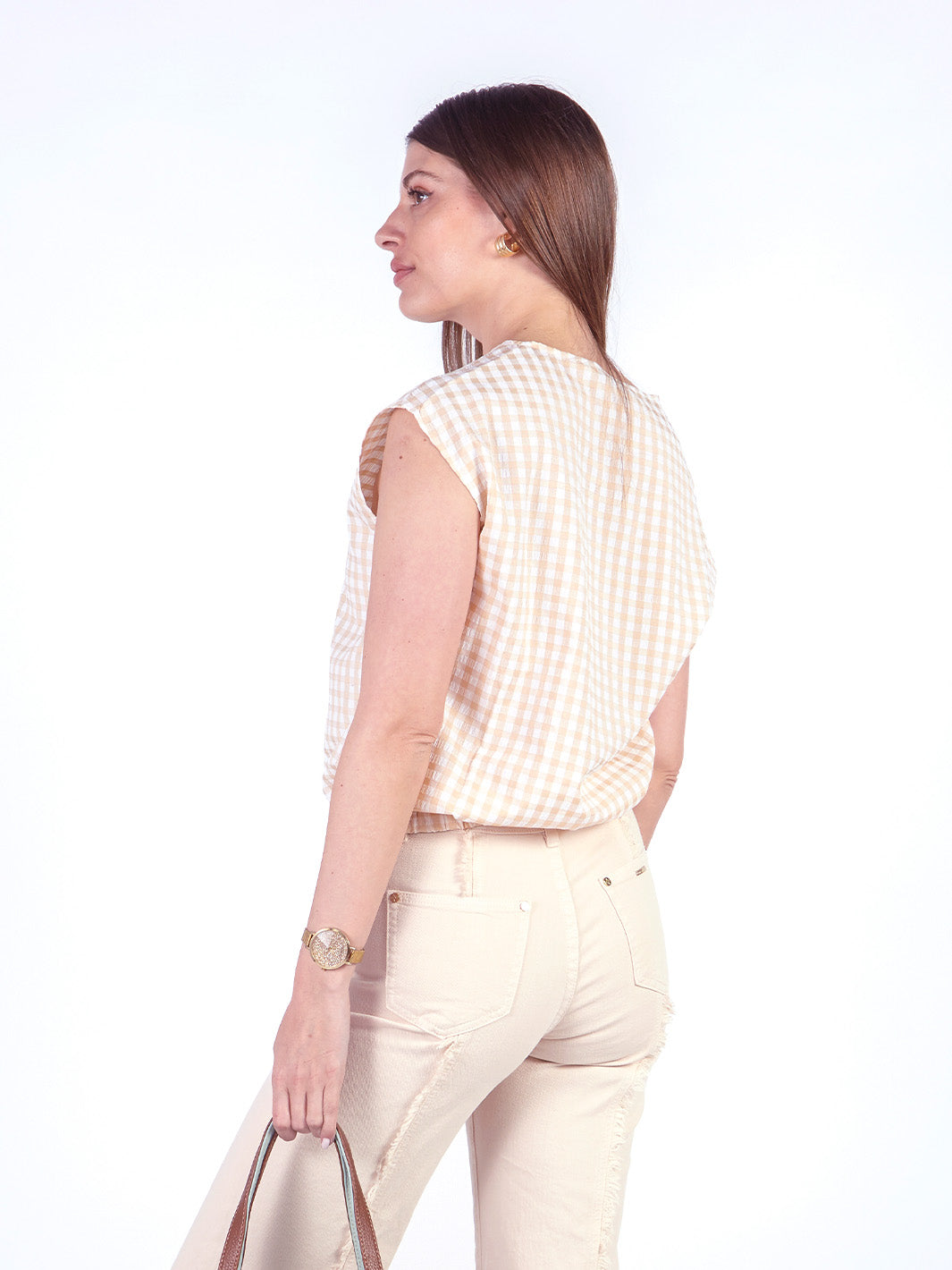 Esta blusa de manga kimono es una opción fresca y delicada para looks casuales con estilo. Presenta un escote en V favorecedor y ha sido confeccionada en un tejido con sutil detalle a cuadros, que aporta textura y un aire romántico. Disponible en tonos suaves como beige, celeste y melón, es ideal para combinar con prendas neutras o complementarias de temporada.