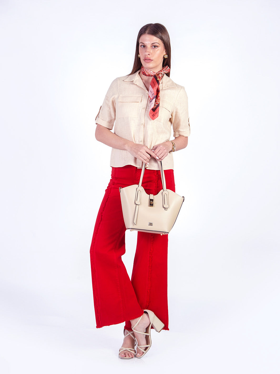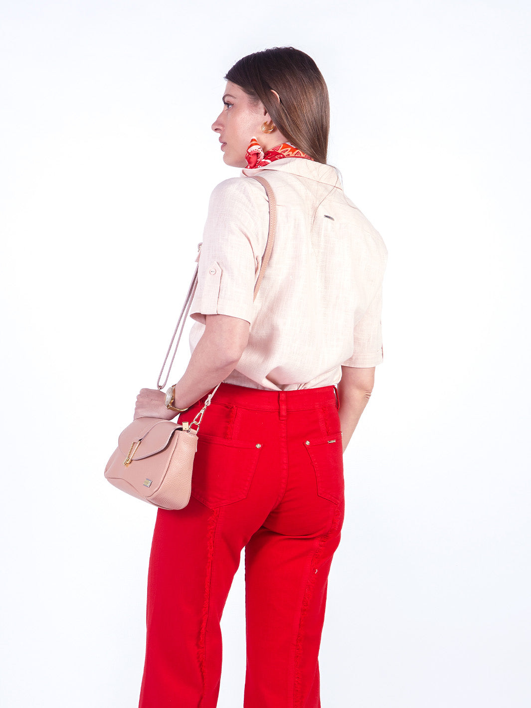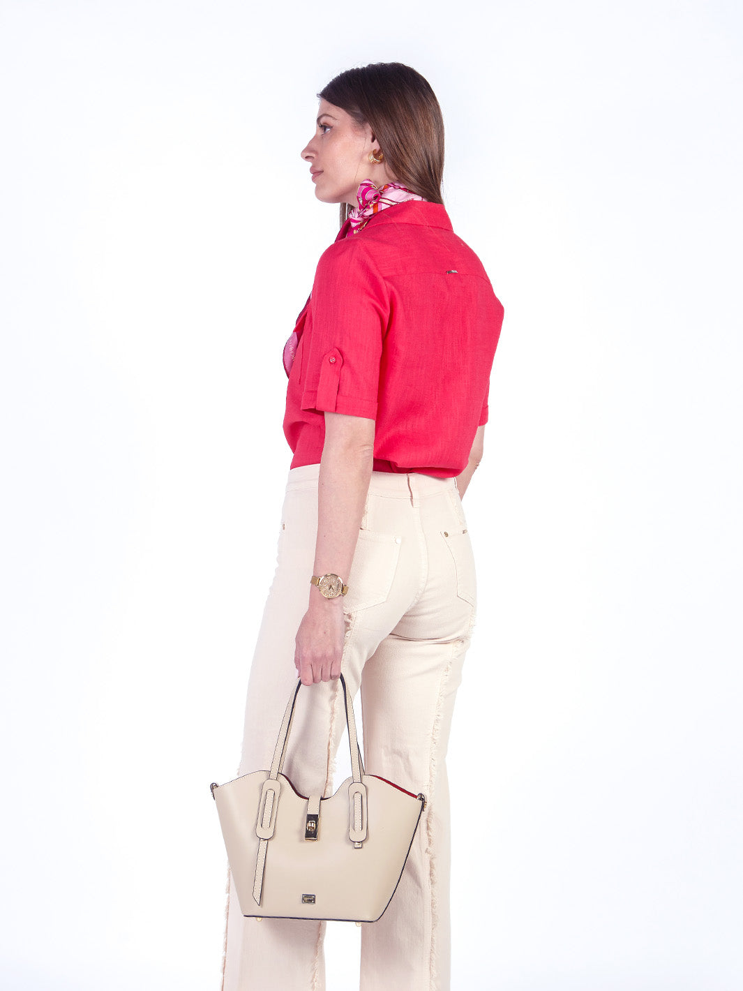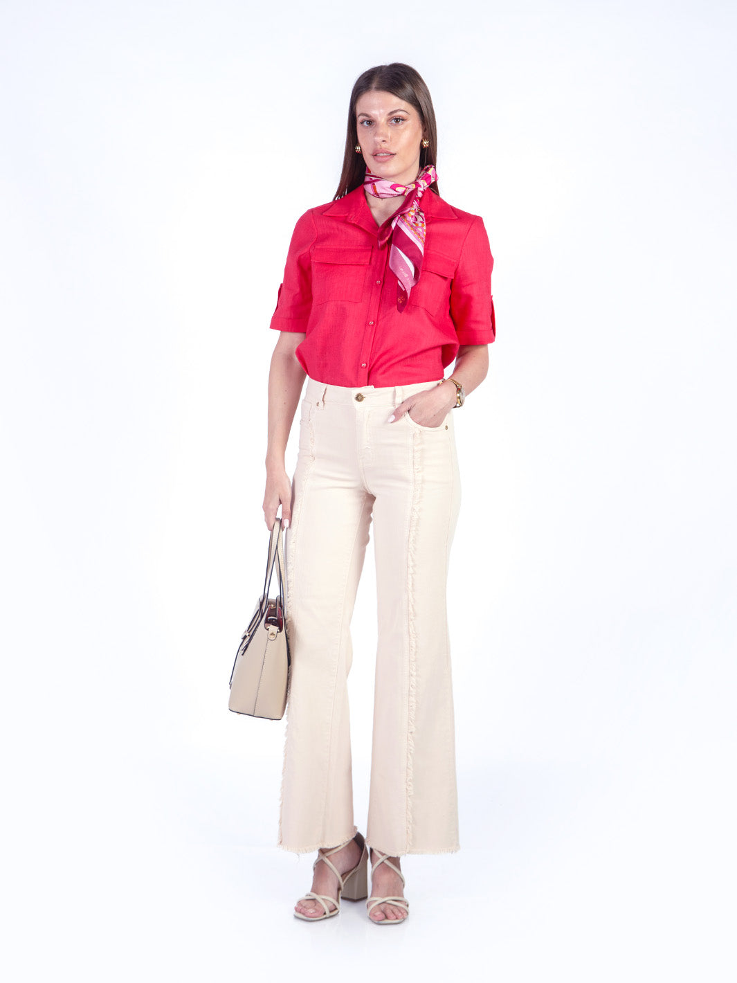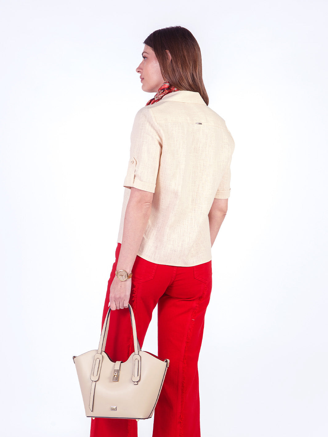 Esta blusa de manga ¾ destaca por su silueta clásica con un toque femenino. Presenta cuello camisero y botones en la pechera que aportan elegancia y versatilidad. Su diseño limpio la convierte en una prenda atemporal, ideal para looks sofisticados o relajados. Disponible en tonos neutros y suaves como hueso, beige, fucsia, palo rosa y celeste, se adapta fácilmente a cualquier armario.