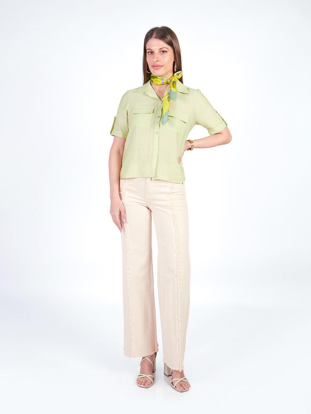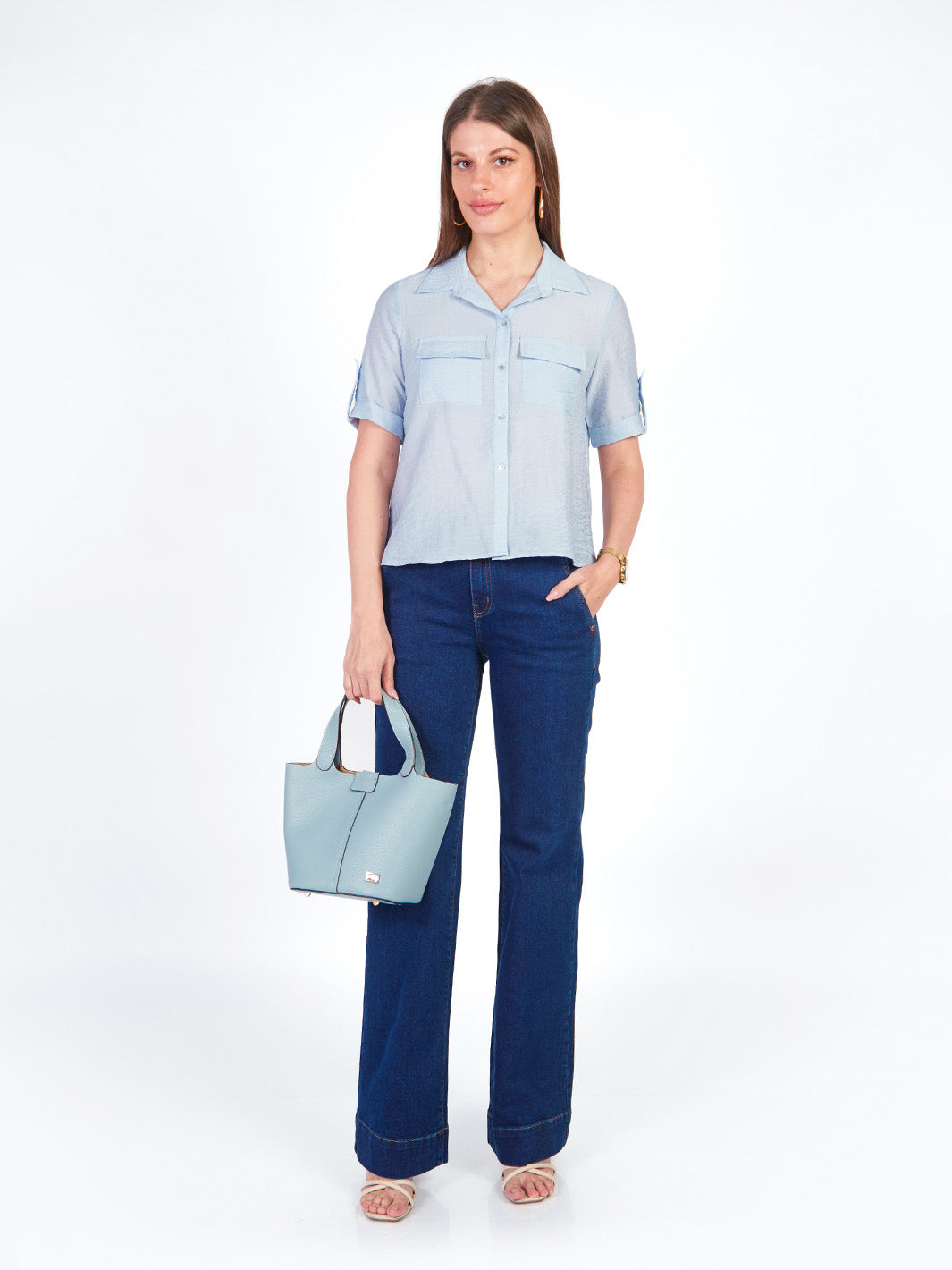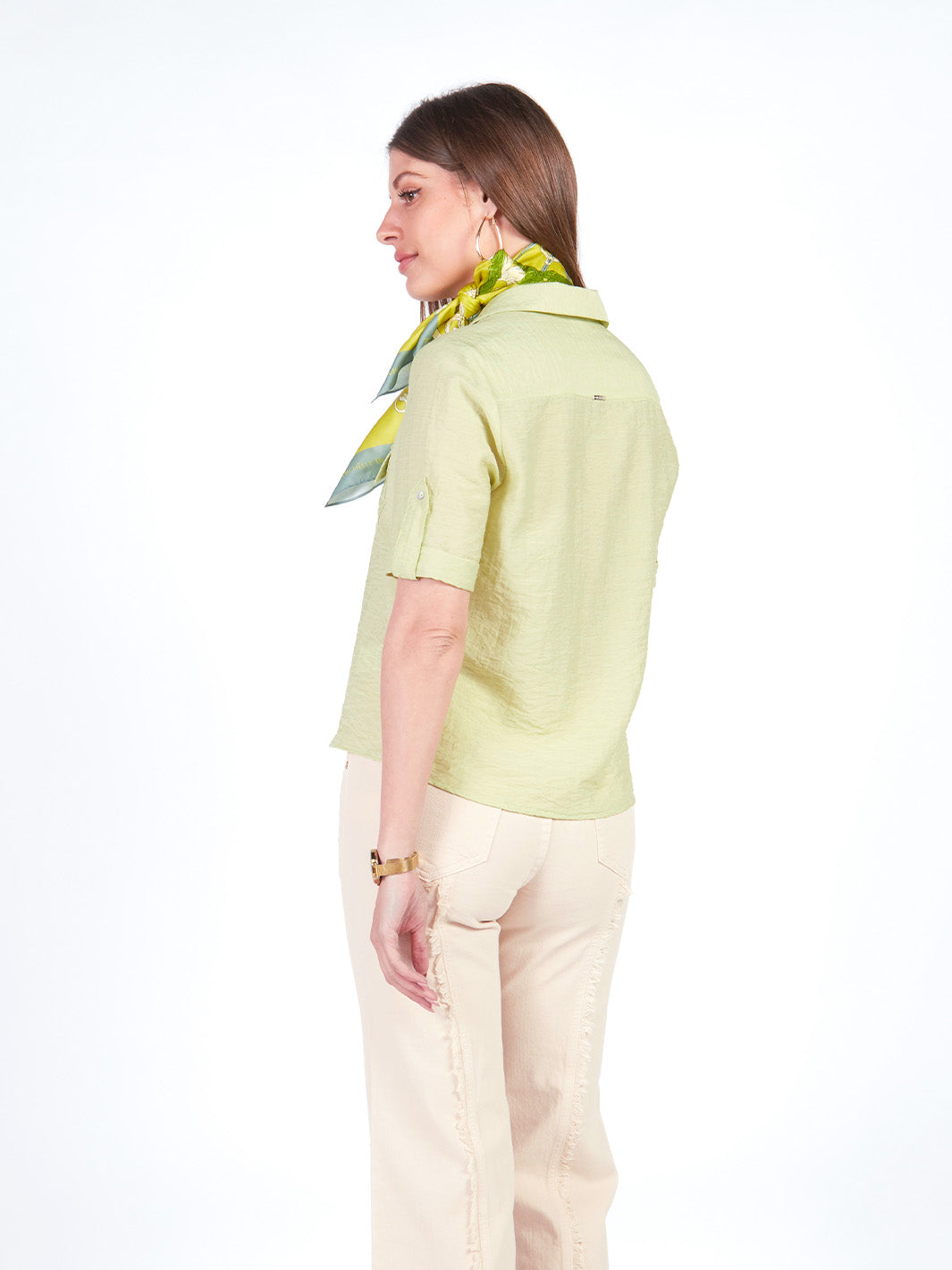 Blusa de manga corta con cuello camisero que aporta un aire clásico y versátil. Su diseño incluye dos tapas de bolsillo en la pechera, regulador de manga para mayor comodidad y botones en la parte frontal. Confeccionada en un estampado floral que realza cualquier look. Disponible en celeste, hueso, palo rosa y verde.