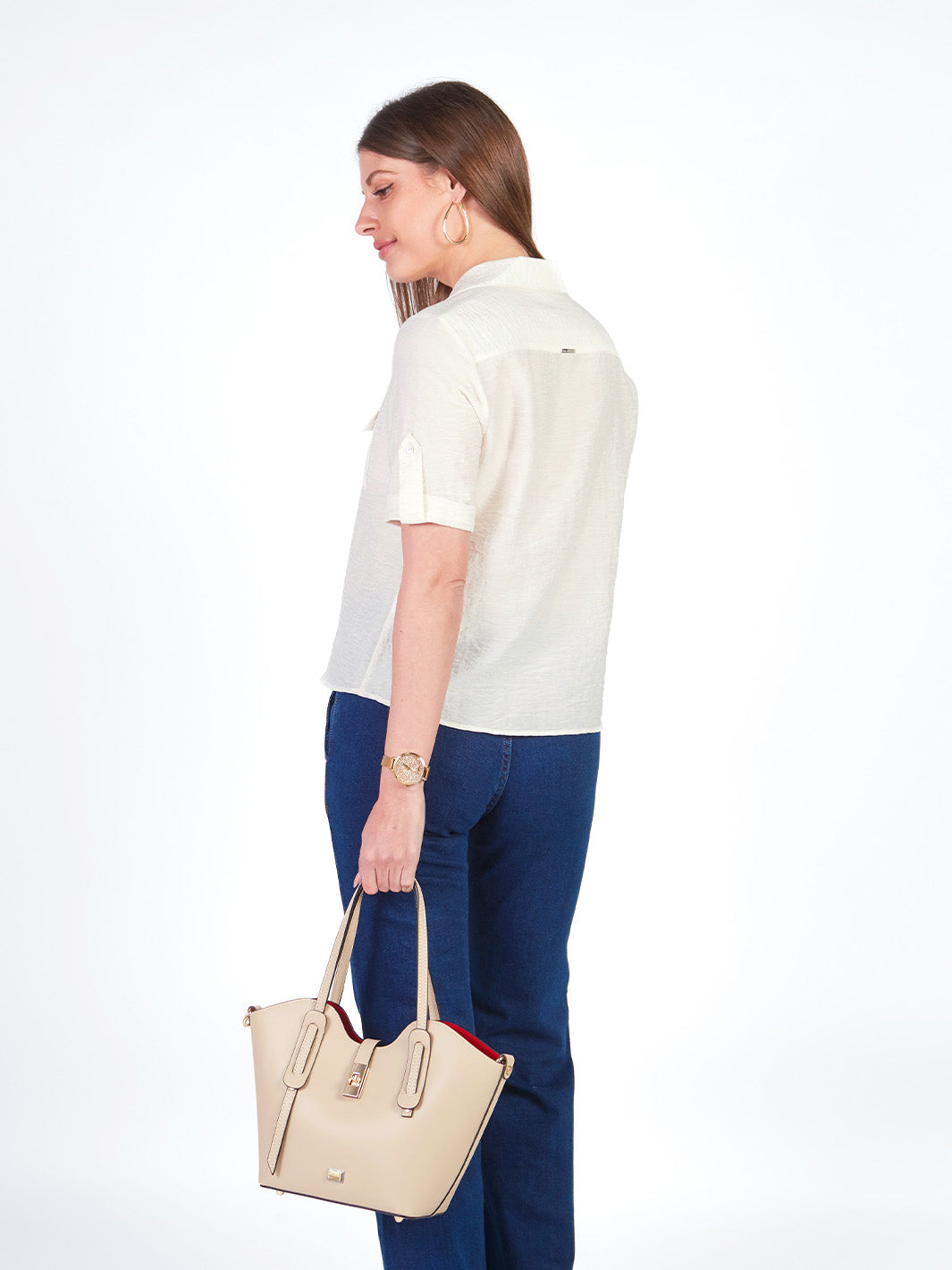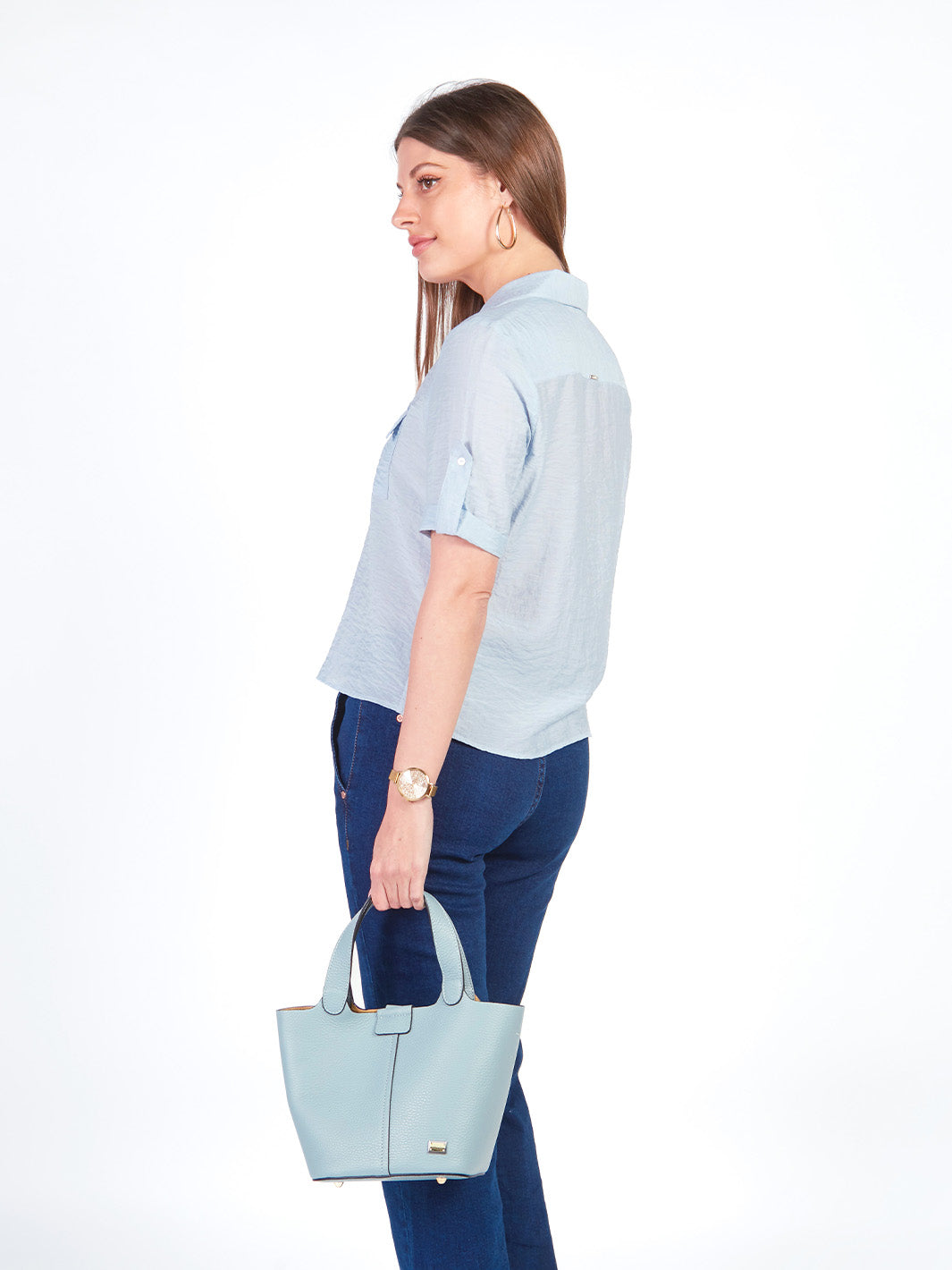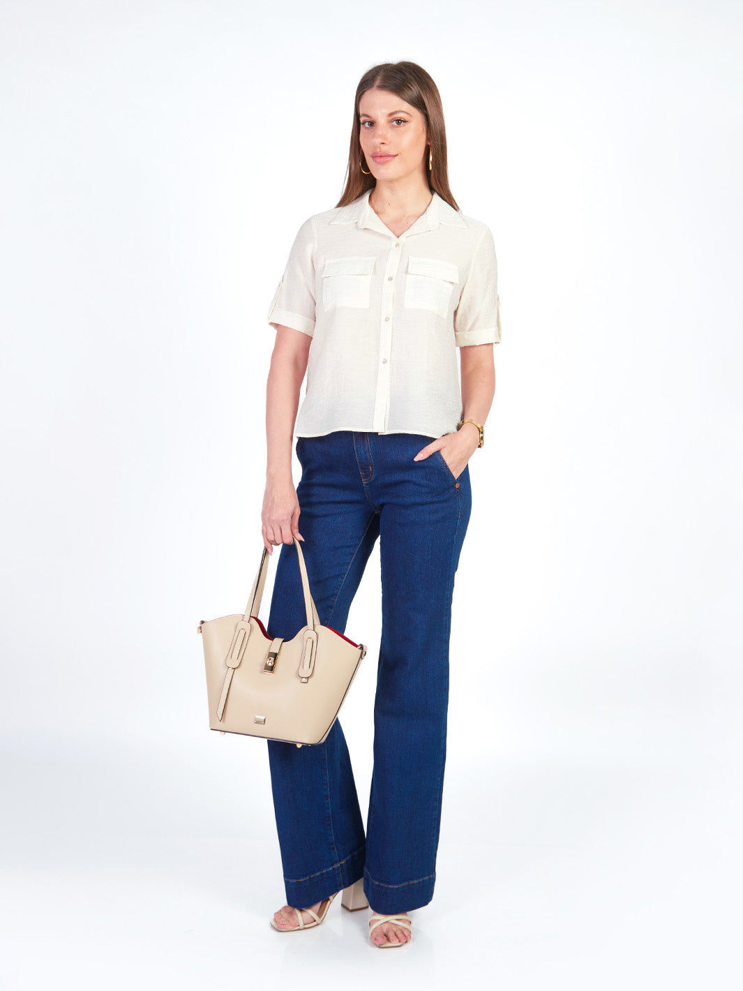 Blusa de manga corta con cuello camisero que aporta un aire clásico y versátil. Su diseño incluye dos tapas de bolsillo en la pechera, regulador de manga para mayor comodidad y botones en la parte frontal. Confeccionada en un estampado floral que realza cualquier look. Disponible en celeste, hueso, palo rosa y verde.