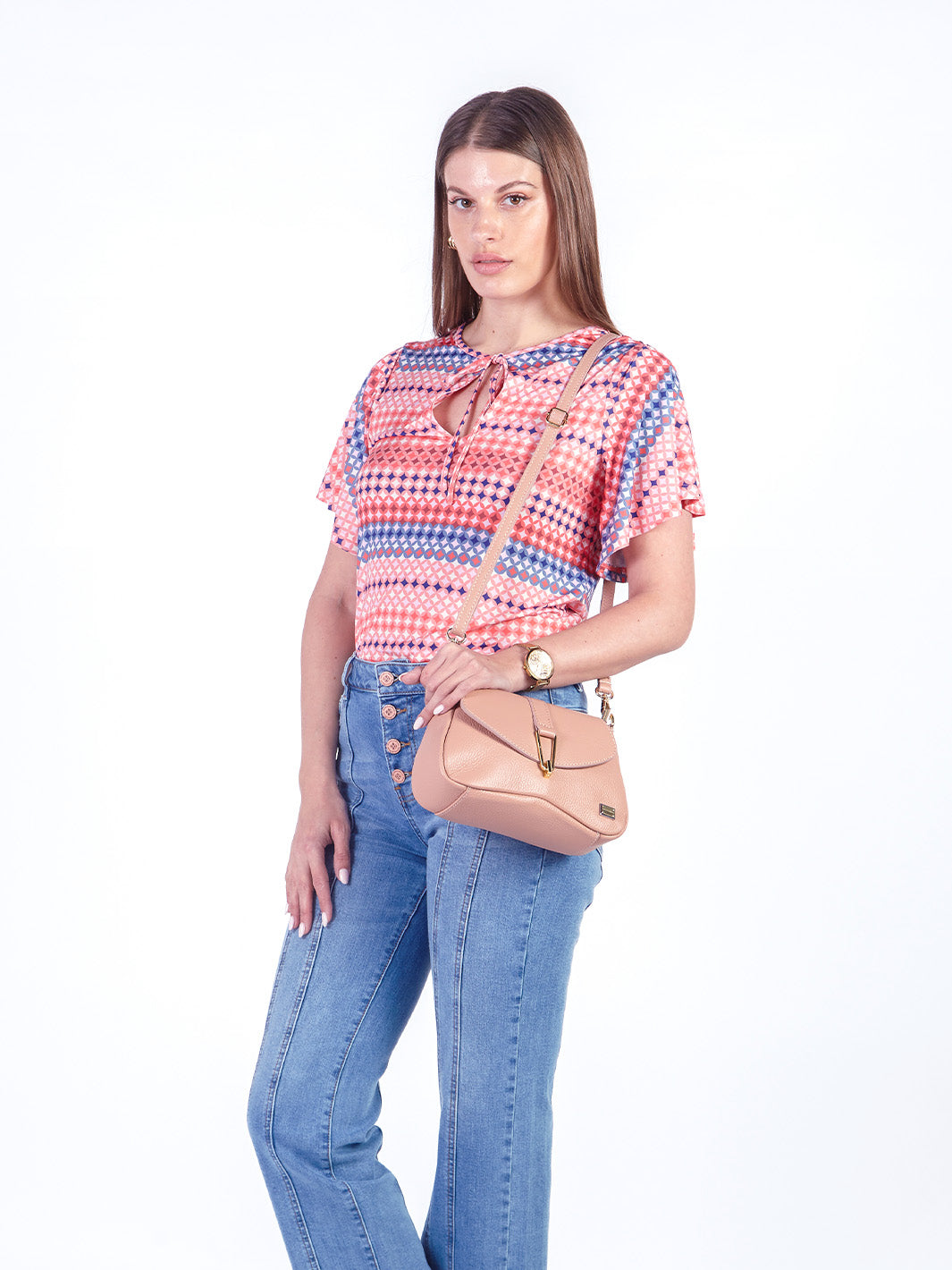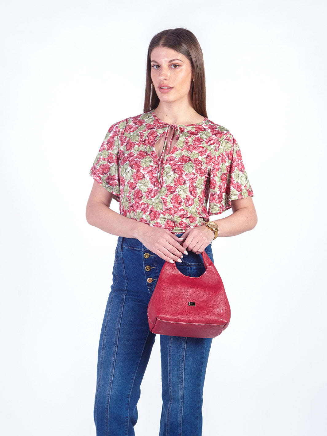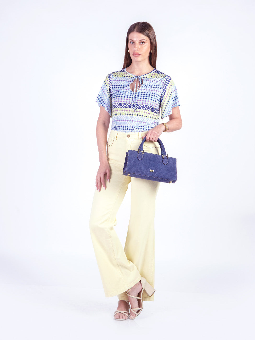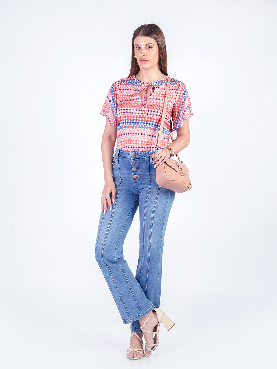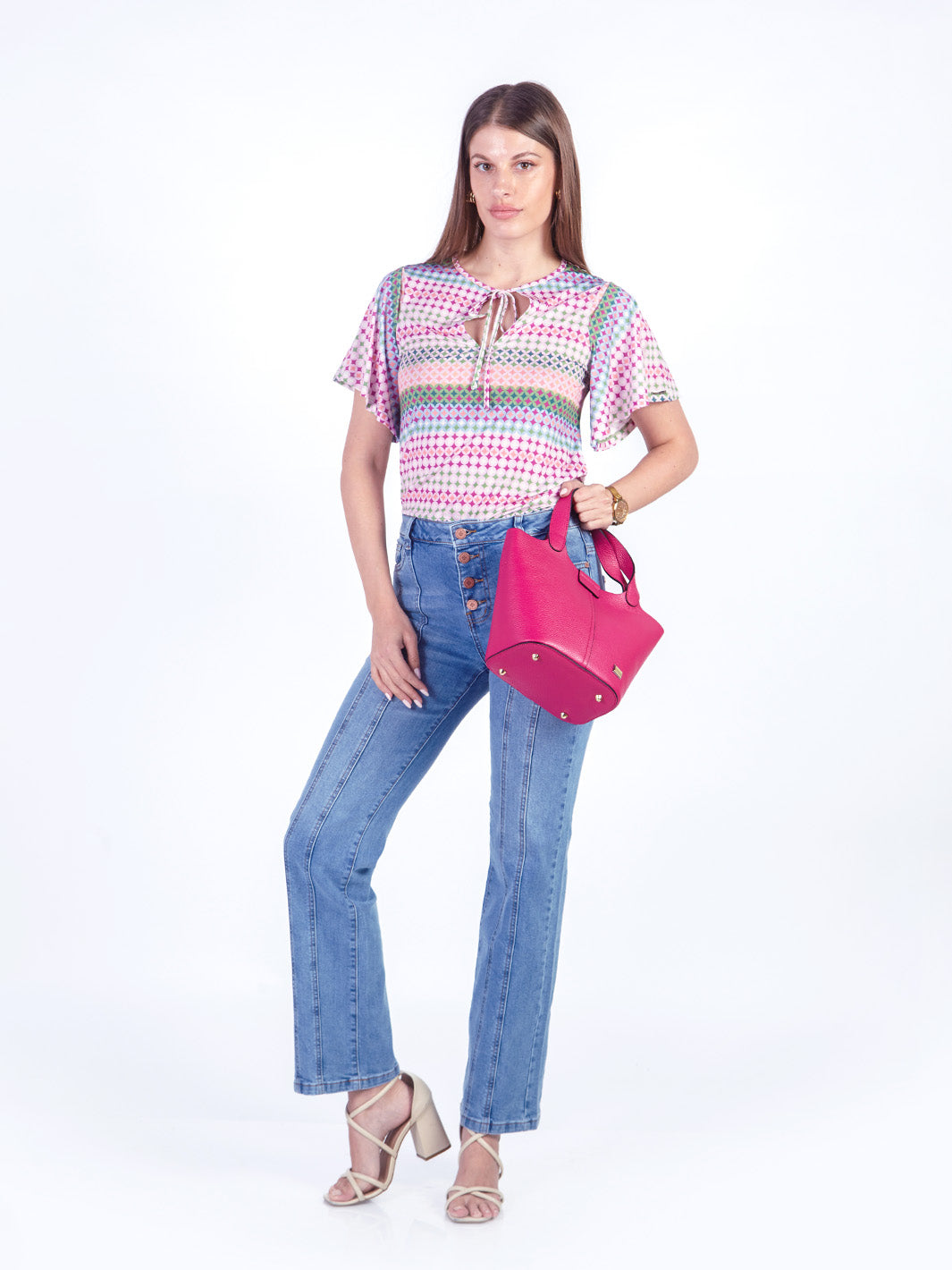Este polo manga corta combina frescura y estilo en una silueta femenina con toques románticos. Su escote redondo con detalle en V y lazo ajustable aporta delicadeza, mientras que los bobos en las mangas añaden un aire encantador. El estampado aporta un toque vibrante y está disponible en tonos verde, naranja, celeste, azul y rojo.