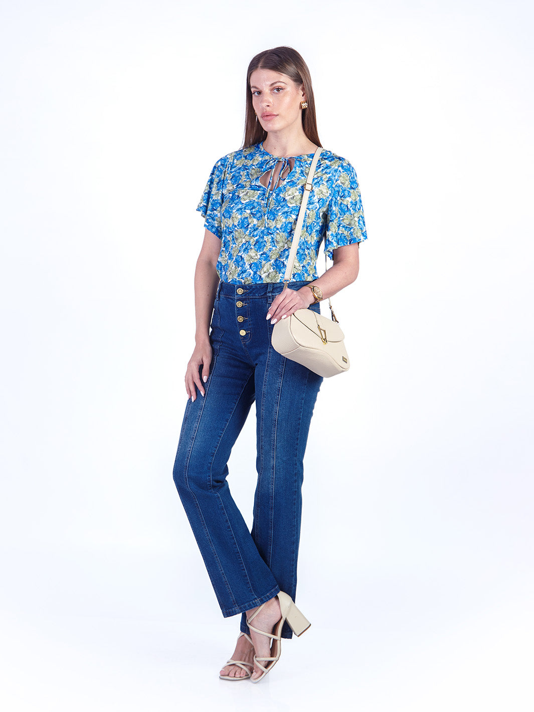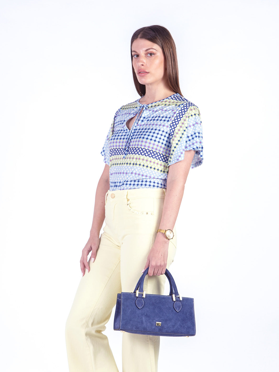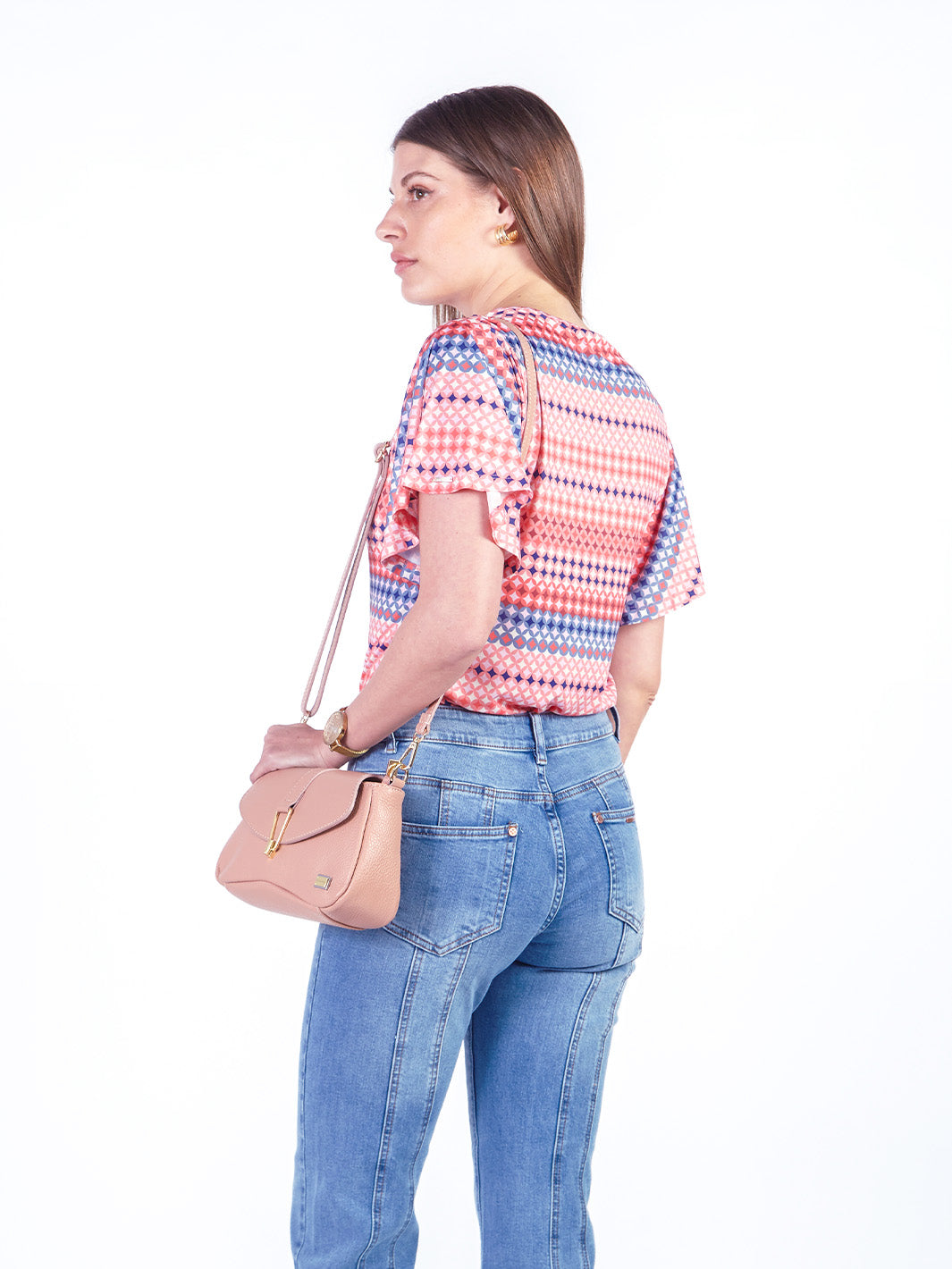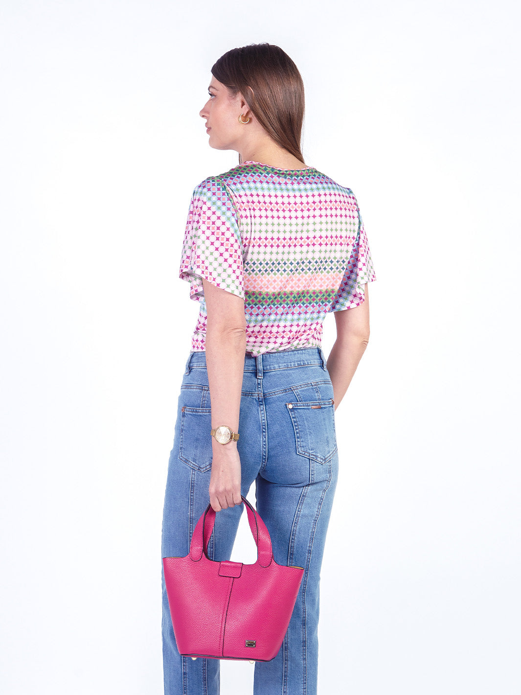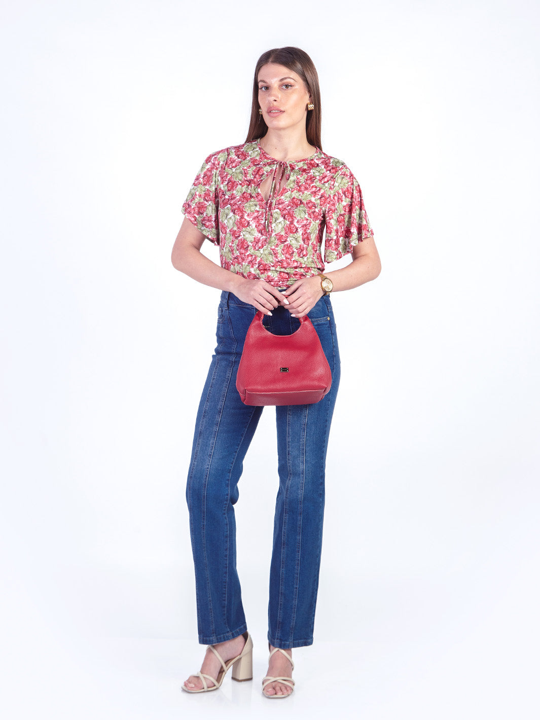 Este polo manga corta combina frescura y estilo en una silueta femenina con toques románticos. Su escote redondo con detalle en V y lazo ajustable aporta delicadeza, mientras que los bobos en las mangas añaden un aire encantador. El estampado aporta un toque vibrante y está disponible en tonos verde, naranja, celeste, azul y rojo.
