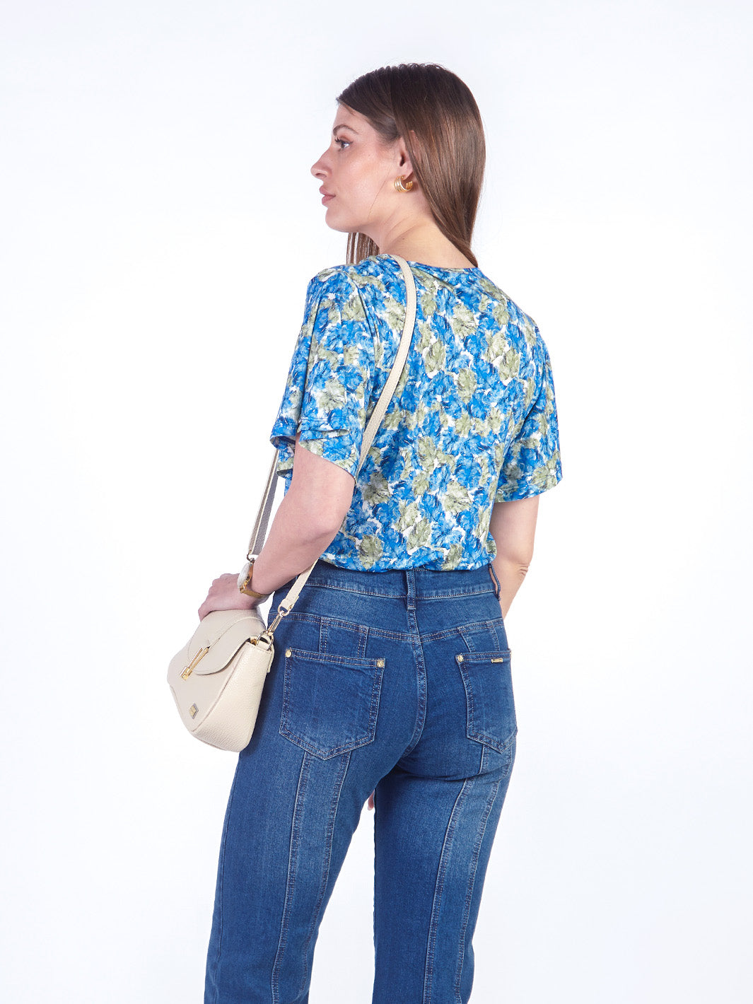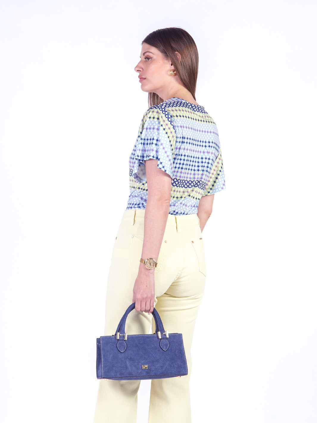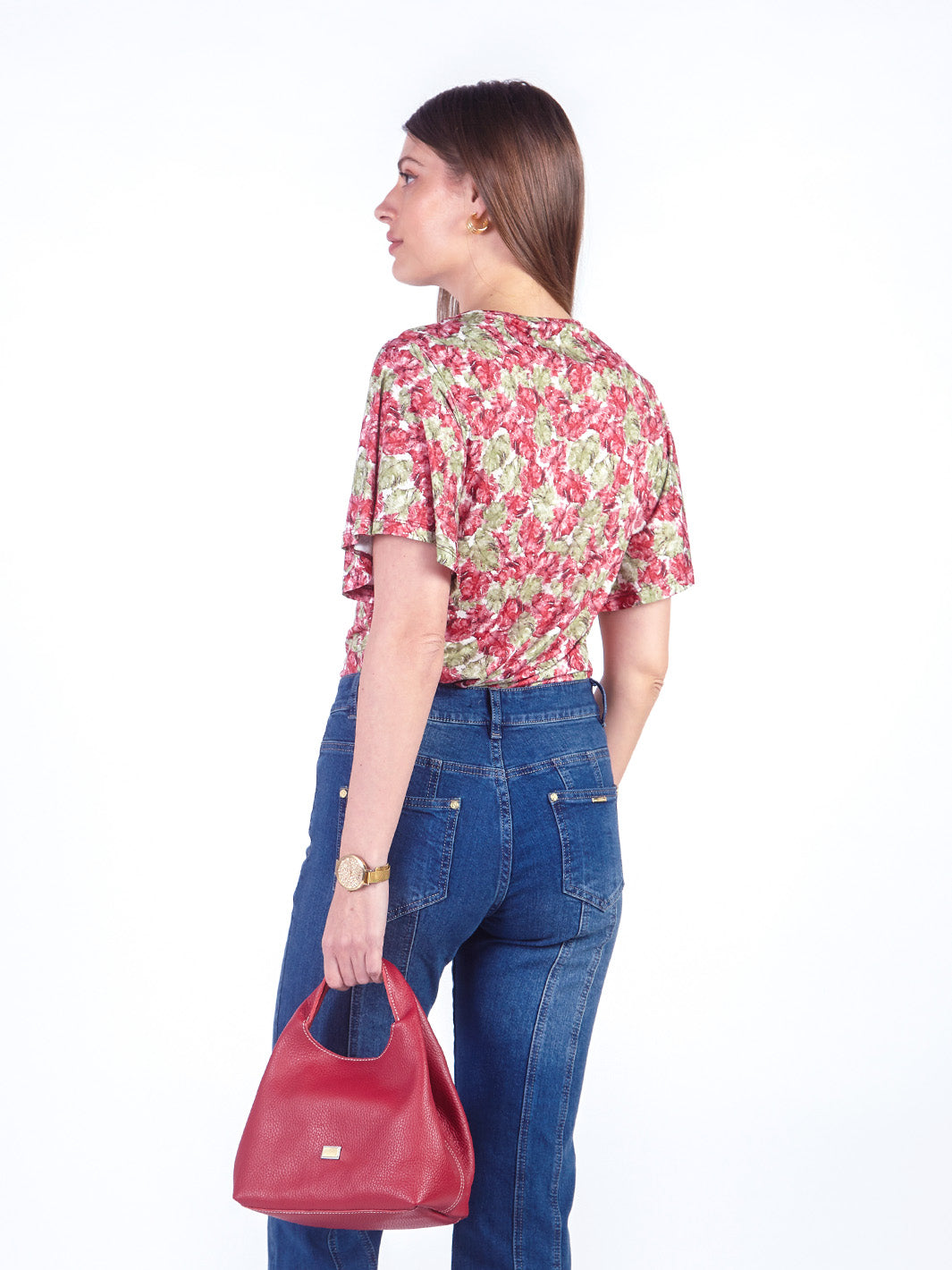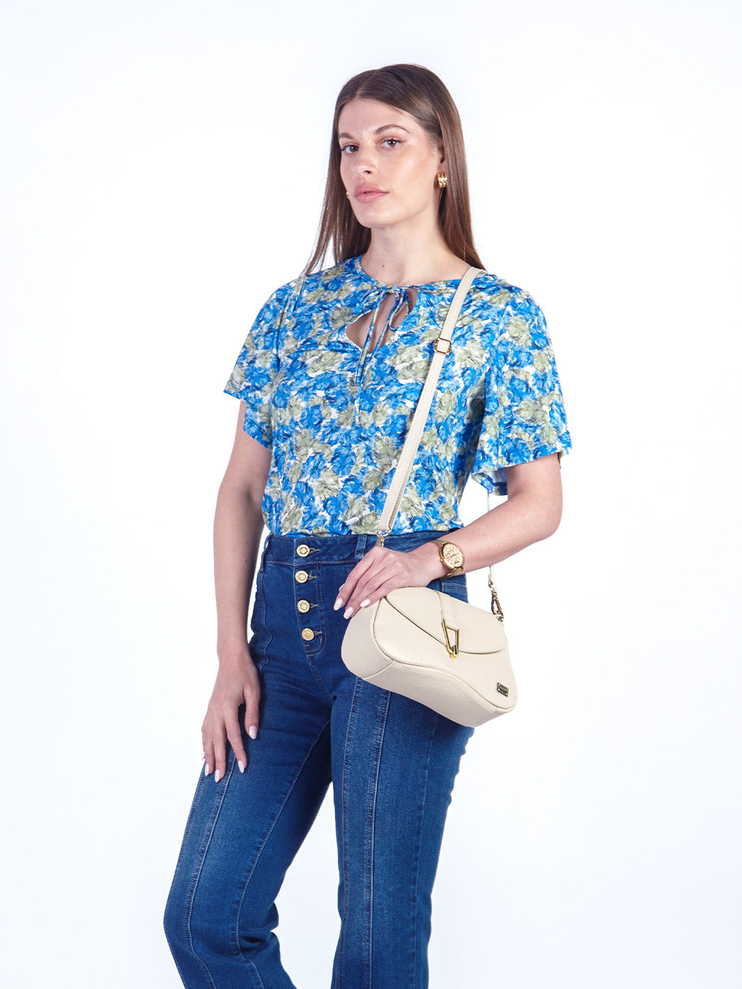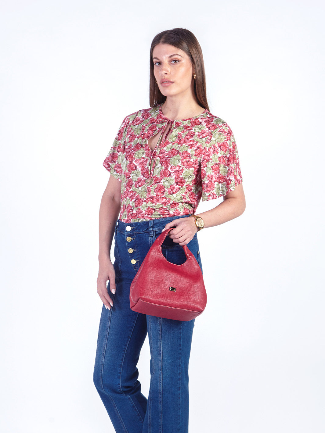 Este polo manga corta combina frescura y estilo en una silueta femenina con toques románticos. Su escote redondo con detalle en V y lazo ajustable aporta delicadeza, mientras que los bobos en las mangas añaden un aire encantador. El estampado aporta un toque vibrante y está disponible en tonos verde, naranja, celeste, azul y rojo.