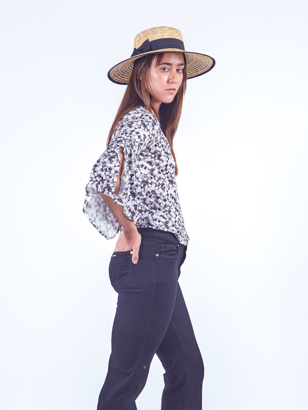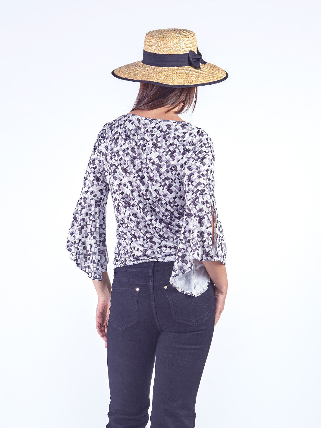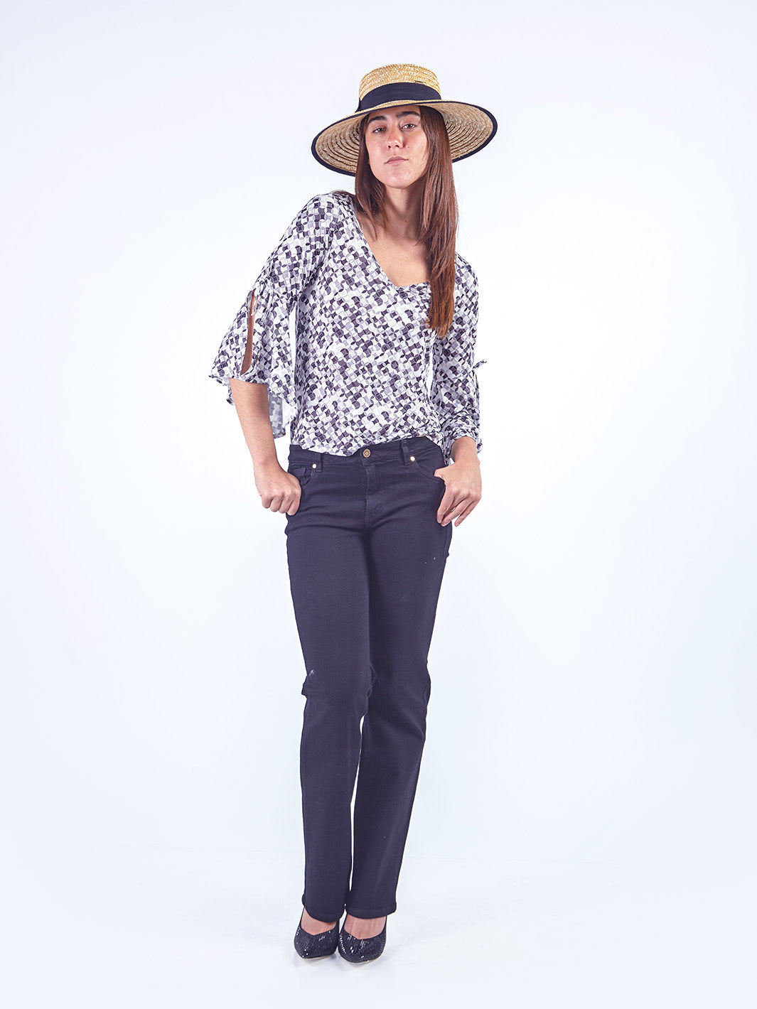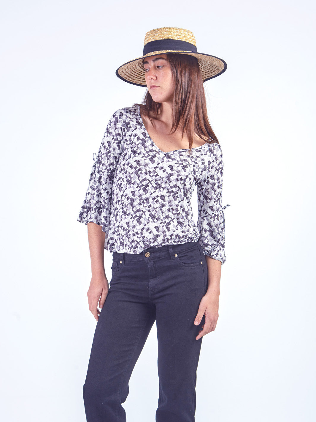 Este polo de manga ¾ es una fusión encantadora entre frescura y romanticismo. Confeccionado en una silueta cómoda, luce un escote en V que estiliza el cuello, bobos delicados y lazos decorativos en las mangas semi acampanadas. Su estampado agrega dinamismo y personalidad. Disponible en tonos ocre y rojo, es ideal para sumar un toque femenino y versátil a tu armario, ya sea para un look casual o uno más elegante.