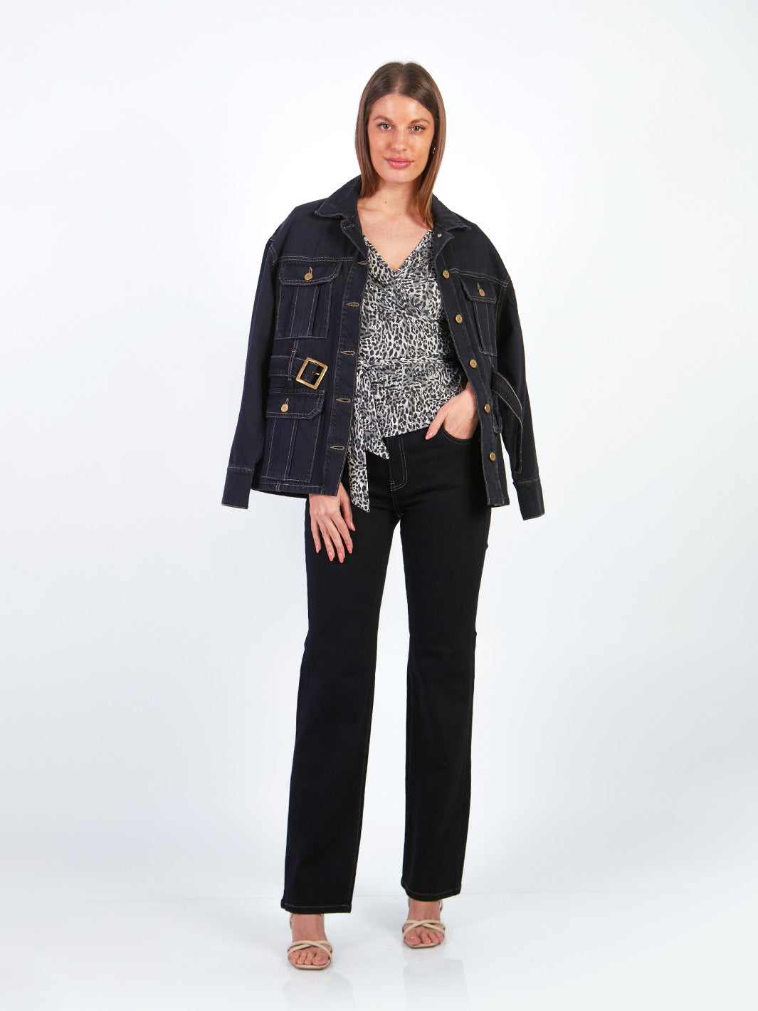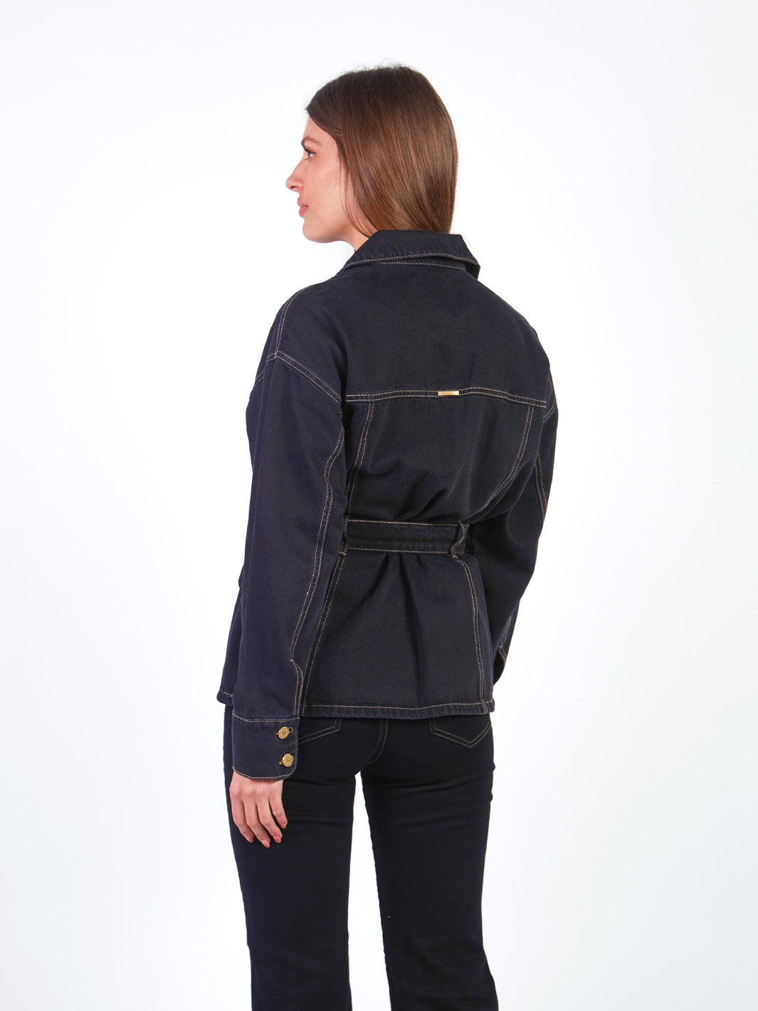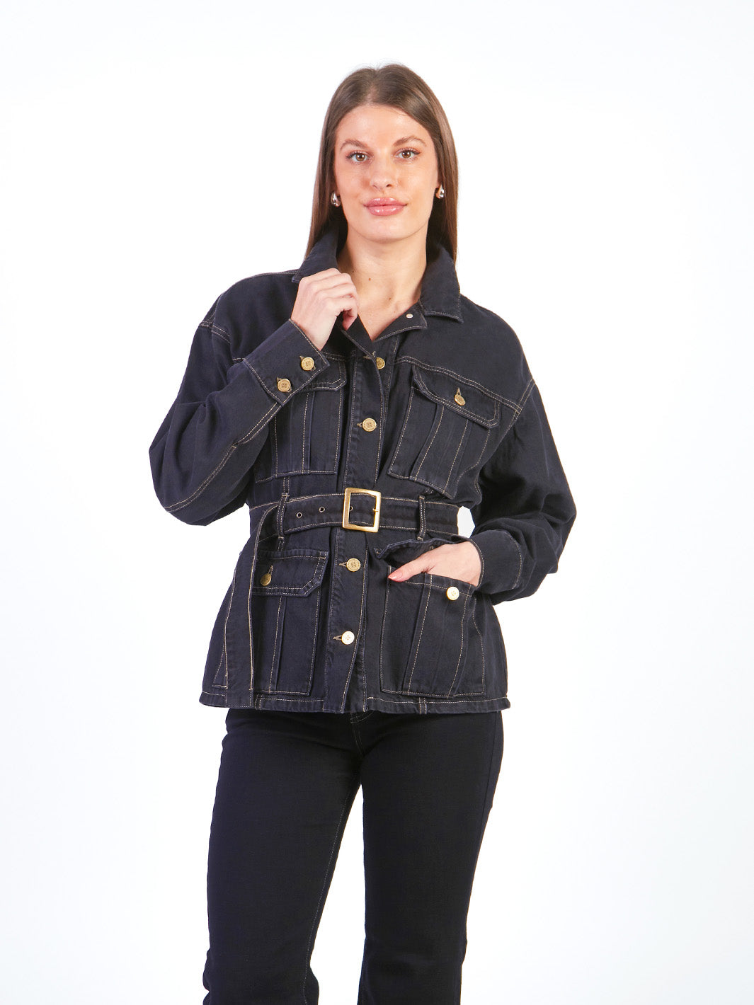 Esta casaca de manga larga en denim combina estilo utilitario con un diseño contemporáneo que eleva cualquier outfit. Presenta un cuello camisero clásico y cuatro bolsillos delanteros con tapa y botón, aportando un aire práctico y moderno. Incluye un cinturón del mismo material que se ajusta mediante presillas, permitiendo definir la silueta con un toque femenino. Los botones metálicos en la pechera y los puños refuerzan su estética estructurada y versátil. Ideal para superponer sobre blusas o vestidos, esta pieza se convierte en un esencial de entretiempo con personalidad y carácter.