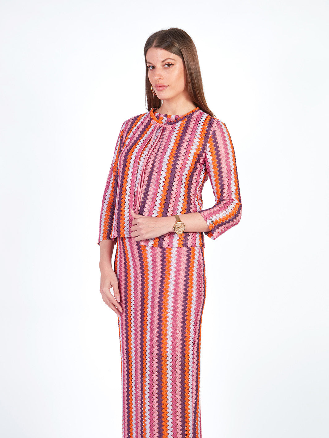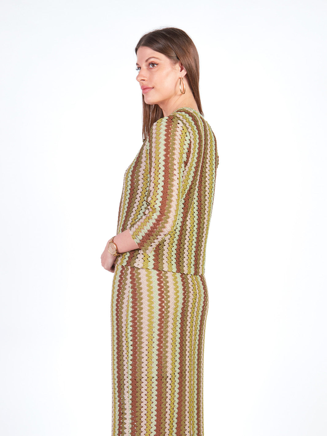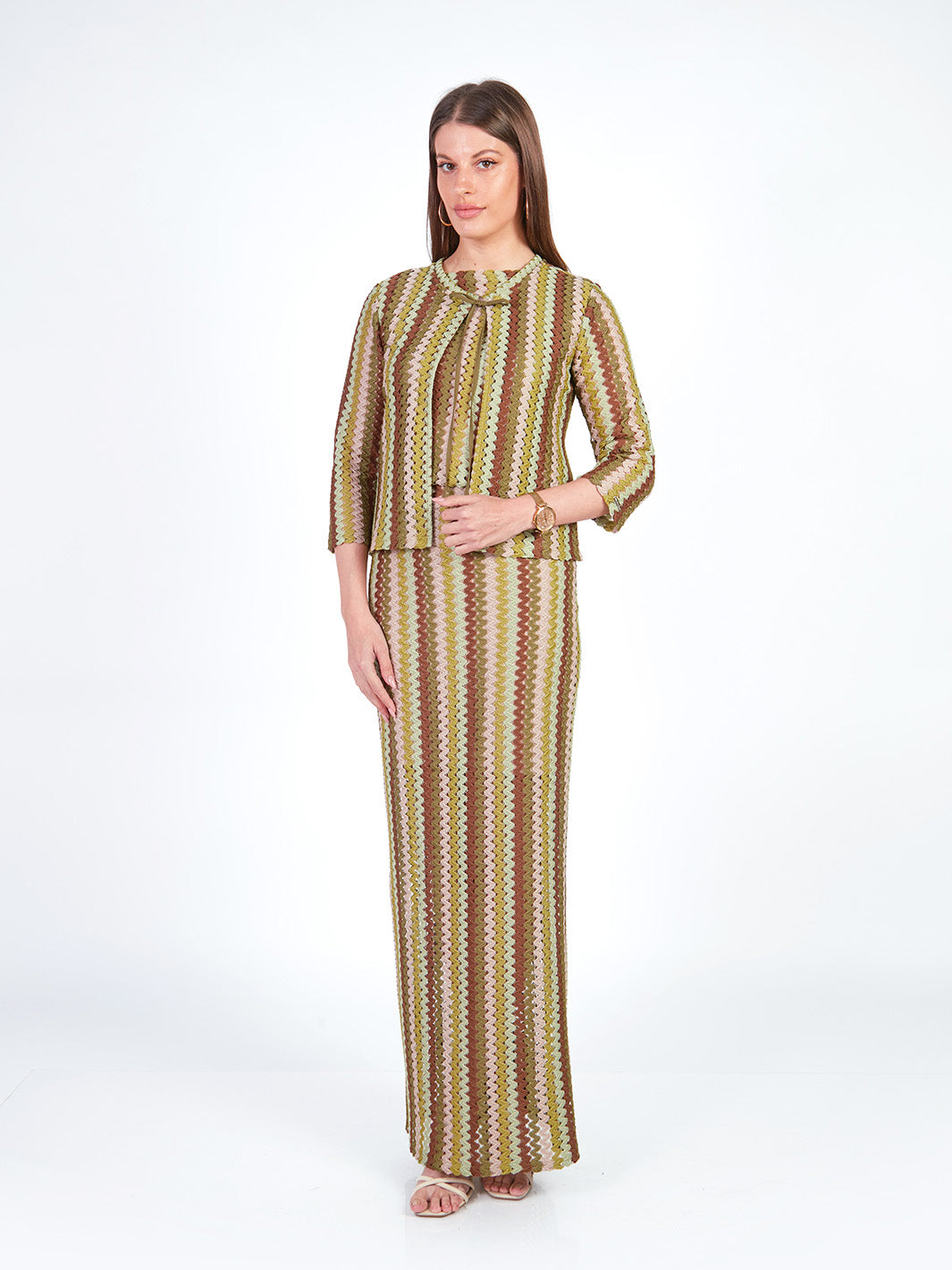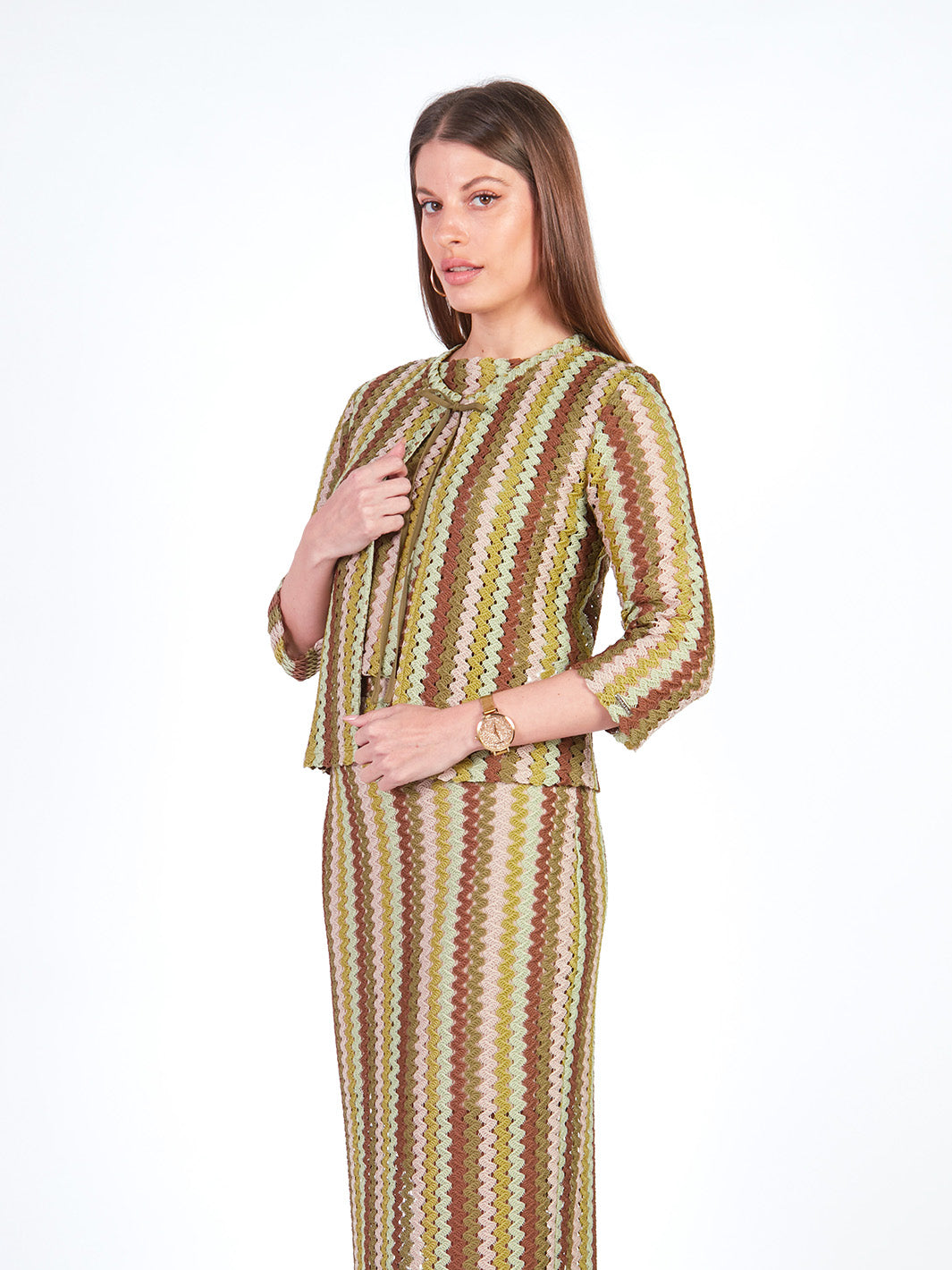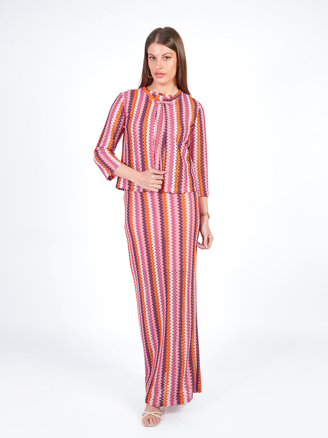 Este cárdigan tejido de manga 3/4 destaca por sus delicados detalles a rayas que aportan textura y estilo. Su escote redondo se complementa con un lazo que permite ajustarlo sutilmente, logrando un look femenino y armonioso. Ideal para llevar como conjunto con su falda larga y polo manga cero a juego. Disponible en tonos: morado, verde.