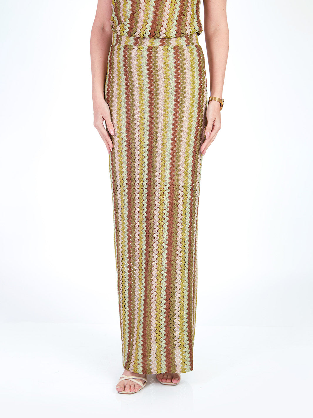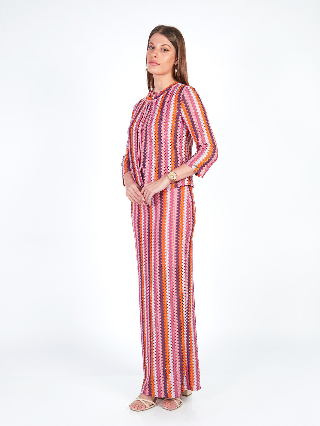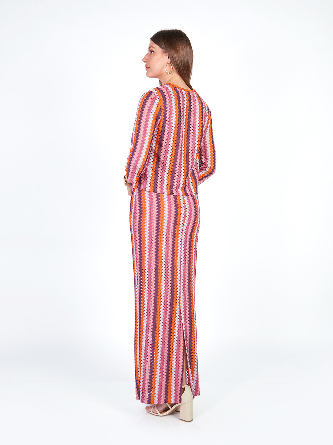 Esta falda larga tejida combina comodidad y elegancia en un diseño fluido y moderno. Cuenta con pretina elasticada y falda interna que garantiza mayor confort y movimiento. El detalle a rayas en el tejido aporta un estilo distintivo, ideal para outfits coordinados. Puedes lucirla como conjunto con su polo manga cero y cárdigan manga 3/4 a juego. Disponible en tonos: morado, verde.