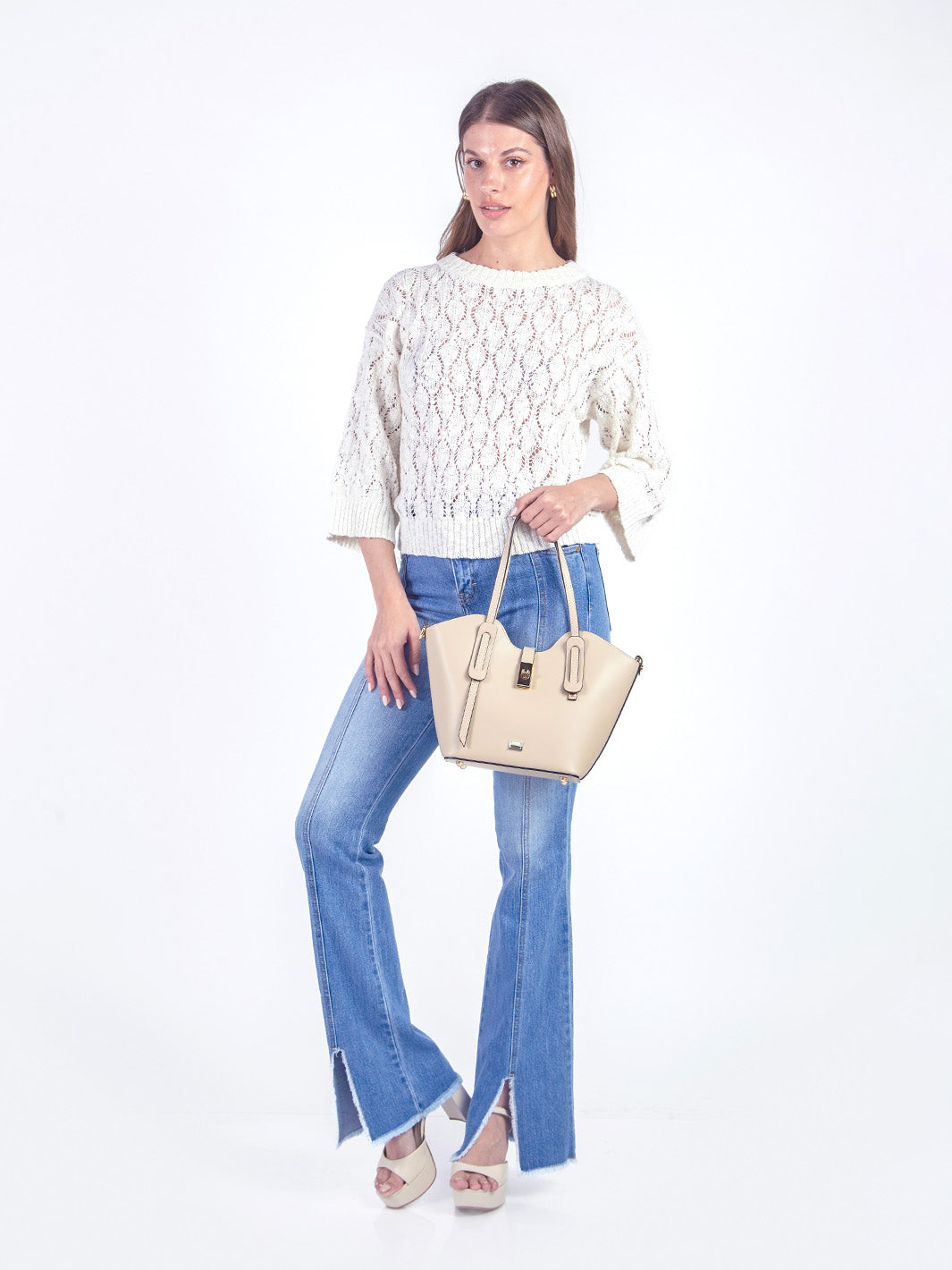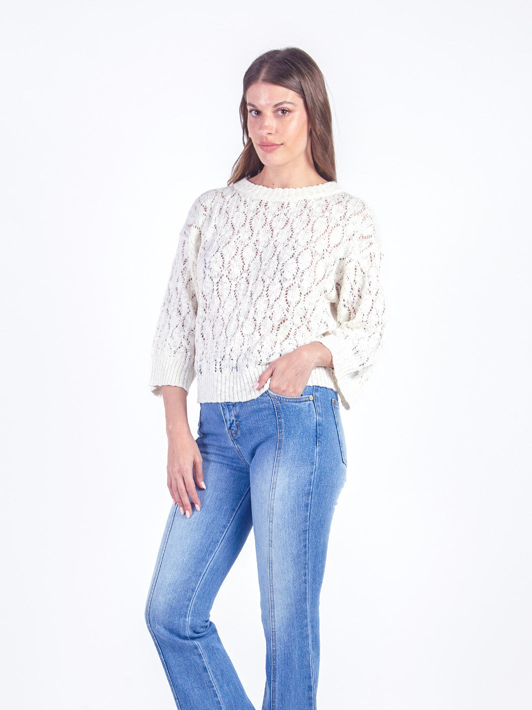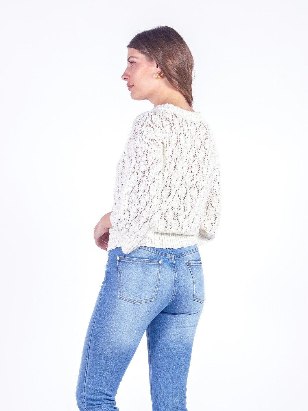 Esta chompa manga larga es una opción sofisticada para elevar tu armario con un toque sutil de diseño. Confeccionada con tejido de detalles texturizados, presenta escote redondo y una silueta con mangas ligeramente acampanadas que aportan movimiento y feminidad. La pretina y los puños cuentan con acabados acanalados que enmarcan la prenda con un estilo armonioso y delicado. Ideal para acompañar tus looks de temporada con comodidad y elegancia.