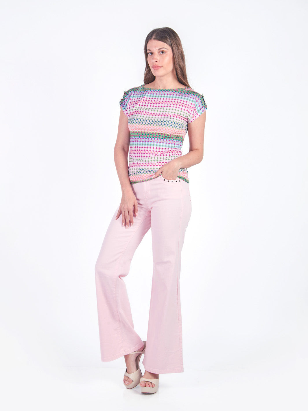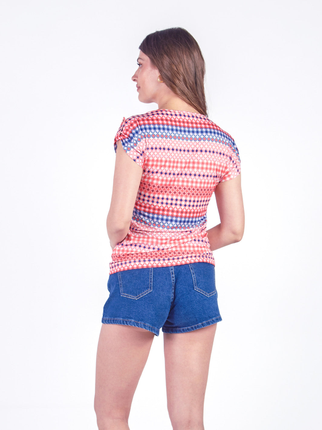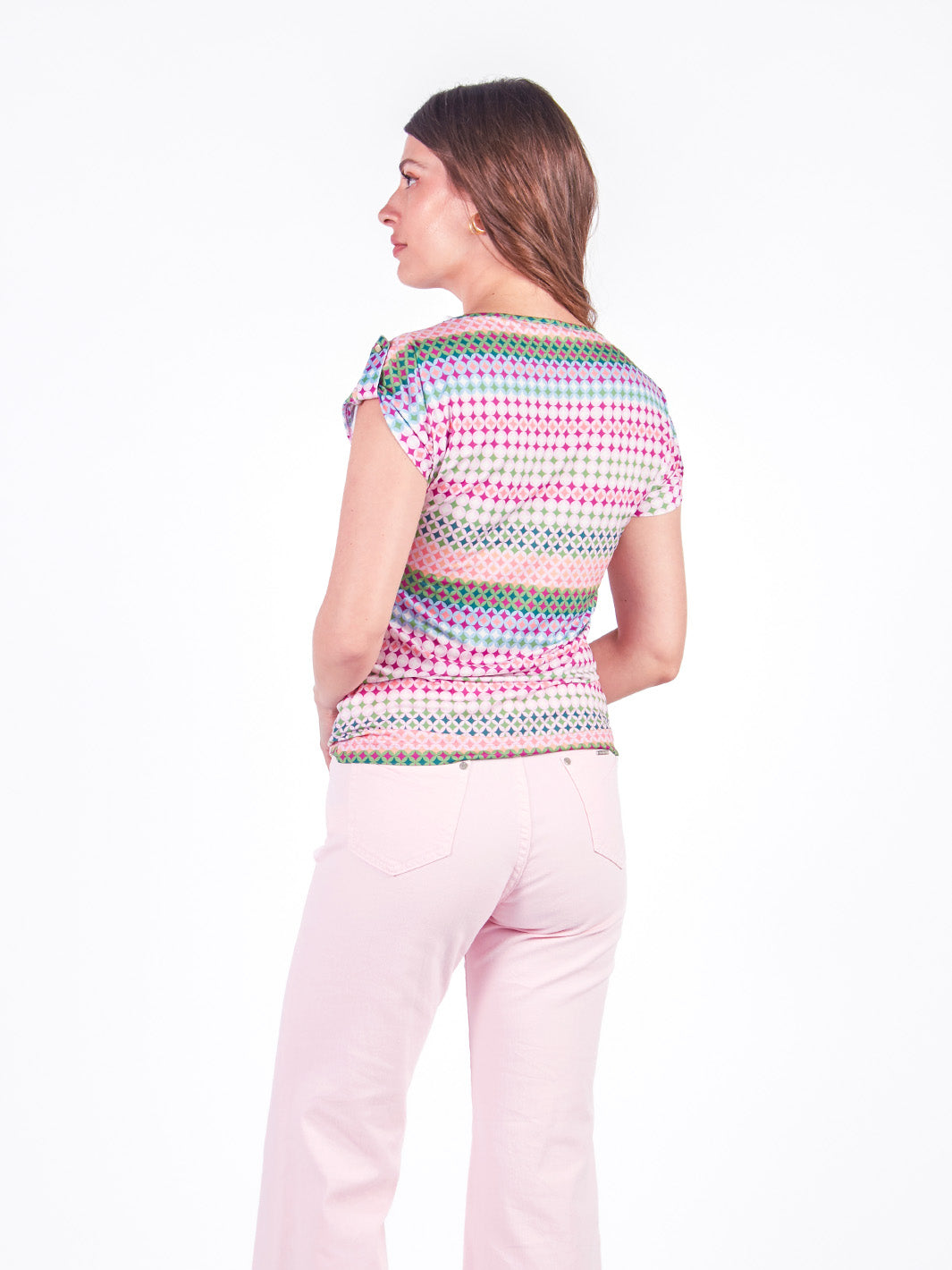 Este polo de manga corta destaca por su escote ojal que añade un toque femenino y favorecedor. El regulador de manga permite un ajuste versátil, mientras que el estampado geométrico aporta modernidad y estilo. Perfecto para looks casuales con un giro contemporáneo, es ideal para combinar con jeans o pantalones de tonos neutros.