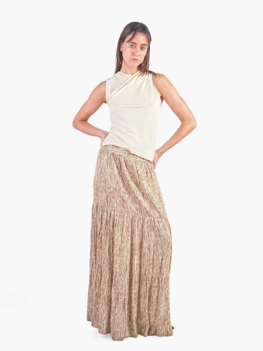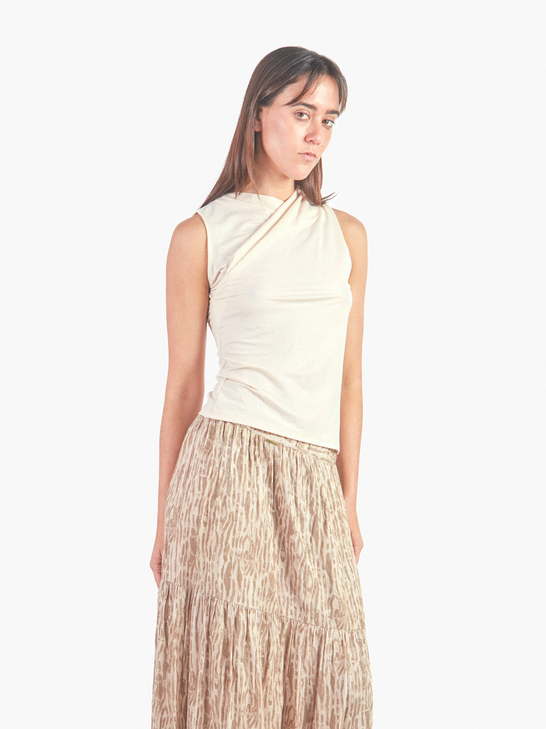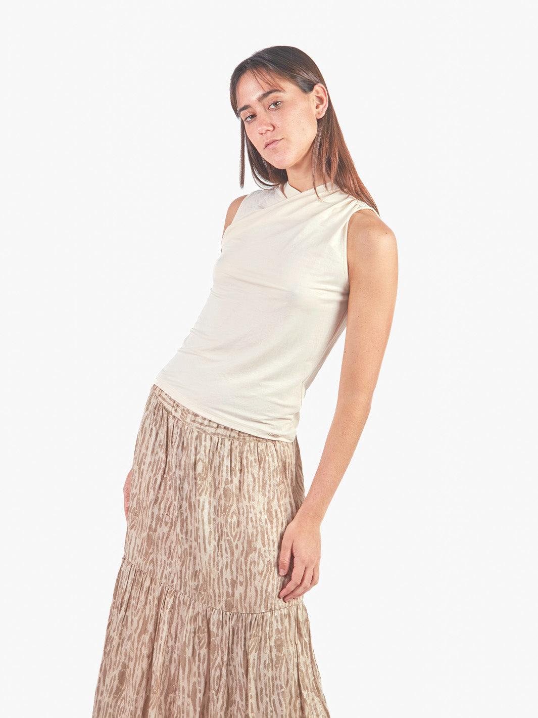 Polo sin mangas con escote ojal que realza la parte superior del torso con un toque sutil y femenino. Su diseño incorpora una tela superpuesta en la pechera que aporta un detalle visual sofisticado y moderno. Ideal para looks frescos y elegantes, es una prenda versátil que combina fácilmente con pantalones, faldas o blazers.