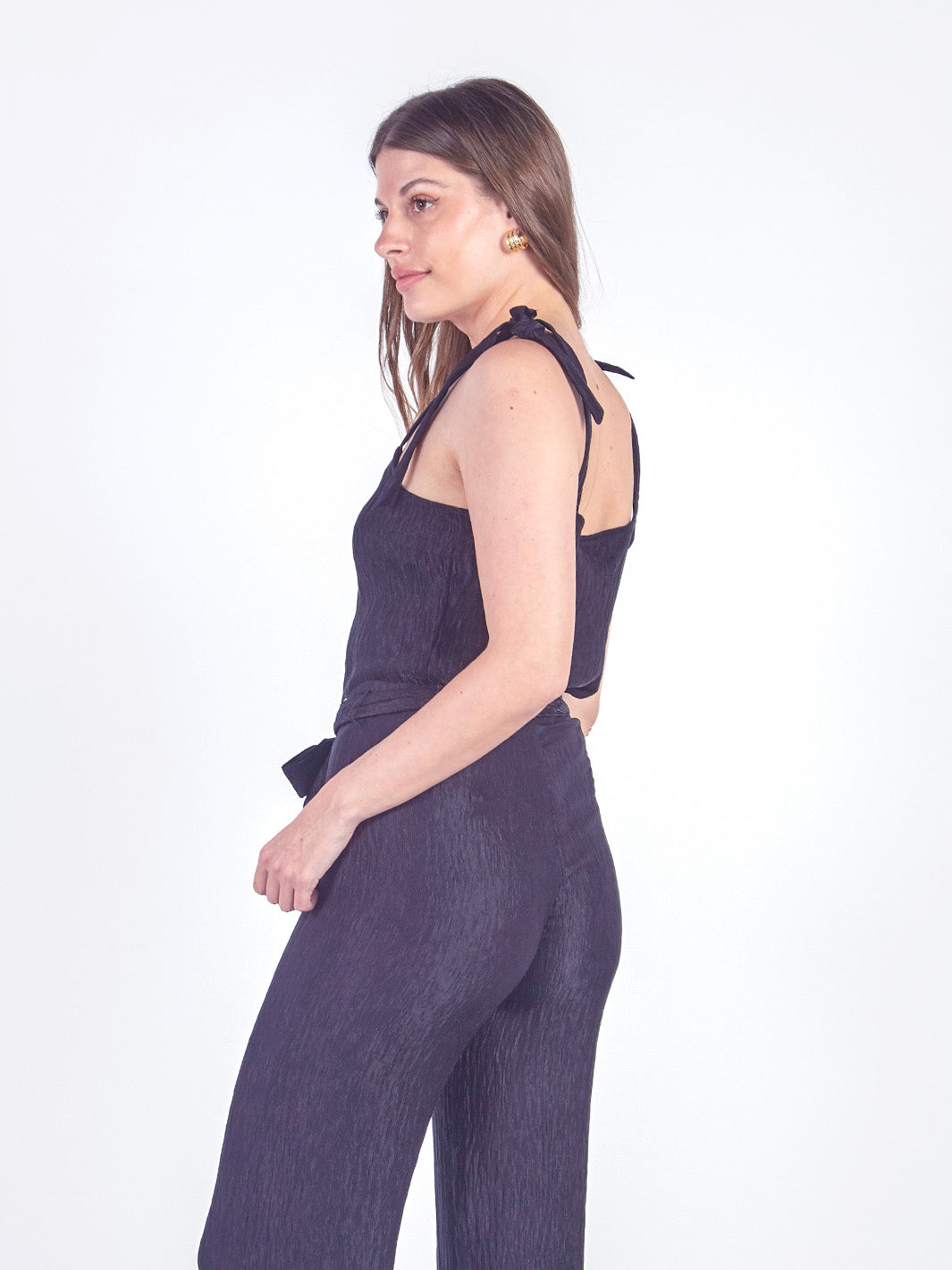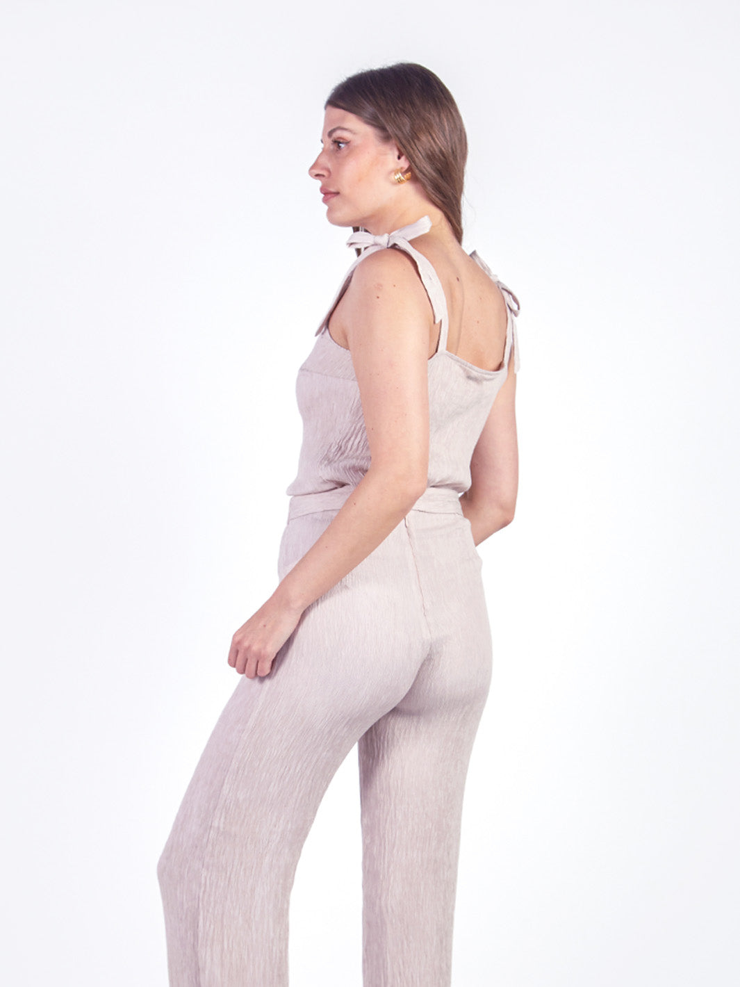 Este top de manga cero destaca por su escote cuadrado que realza sutilmente el cuello y los hombros. Sus tirantes ajustables permiten un calce cómodo y femenino. Confeccionado en una silueta moderna y favorecedora, se convierte en una prenda esencial para días cálidos. Puedes llevarlo en conjunto con el pantalón a juego, creando un look armonioso y versátil. Disponible en tonos celeste y mostaza.