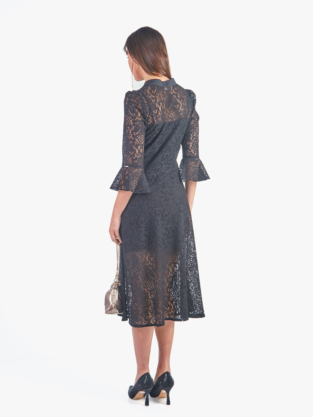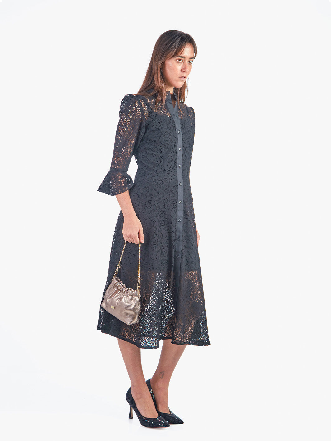 Este vestido de manga ¾ irradia feminidad con su delicado escote redondo y sutiles frunces en los hombros. Los bobos en las mangas añaden un toque romántico, mientras que los botones en la pechera equilibran el diseño con un aire clásico. Confeccionado en un material que resalta por sus detalles de tejido, es una pieza versátil y elegante para ocasiones especiales o looks sofisticados del día a día.