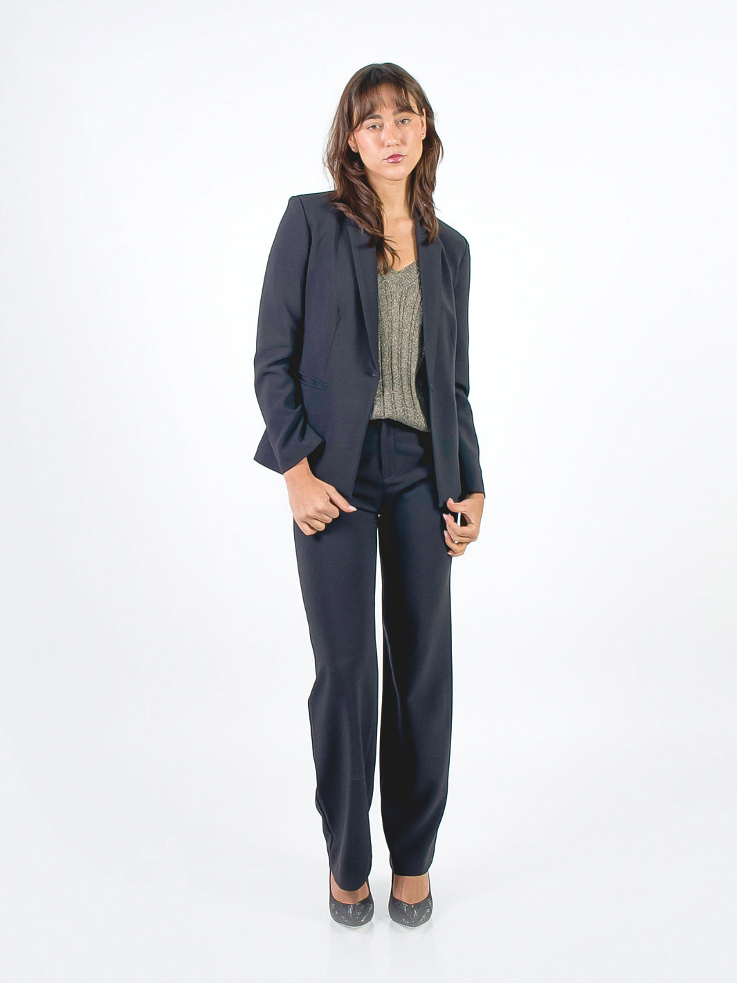 Este saco de manga larga es la definición de sofisticación minimalista. Diseñado con una silueta atemporal, cuenta con un solo botón en la pechera que realza la figura y aporta un toque pulido al look. Los puños presentan tres botones alineados que acentúan el acabado sartorial de la prenda. Su estructura limpia y refinada lo convierte en un básico infaltable para looks de oficina o encuentros más formales. Además, se complementa con un pantalón recto a juego que completa un conjunto versátil, ideal para quienes buscan estilo y elegancia en una sola propuesta.