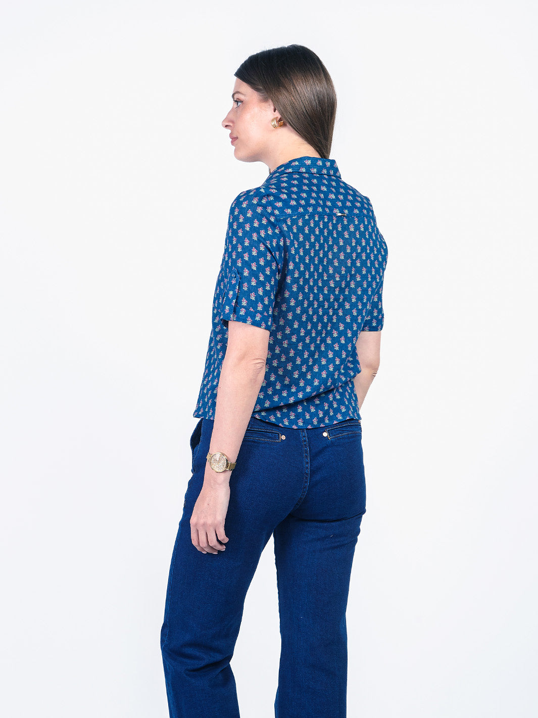Una propuesta encantadora y fuera de lo convencional. Esta blusa de manga tres cuartos combina la elegancia del cuello camisero con un diseño patchwork que entrelaza telas estampadas en tonos azulino y rojo, logrando una composición visual única y artística. Las tapas decorativas en la pechera y el regulador de manga aportan equilibrio entre lo clásico y lo contemporáneo. Ideal para elevar un look casual con personalidad o complementar una propuesta creativa y chic.