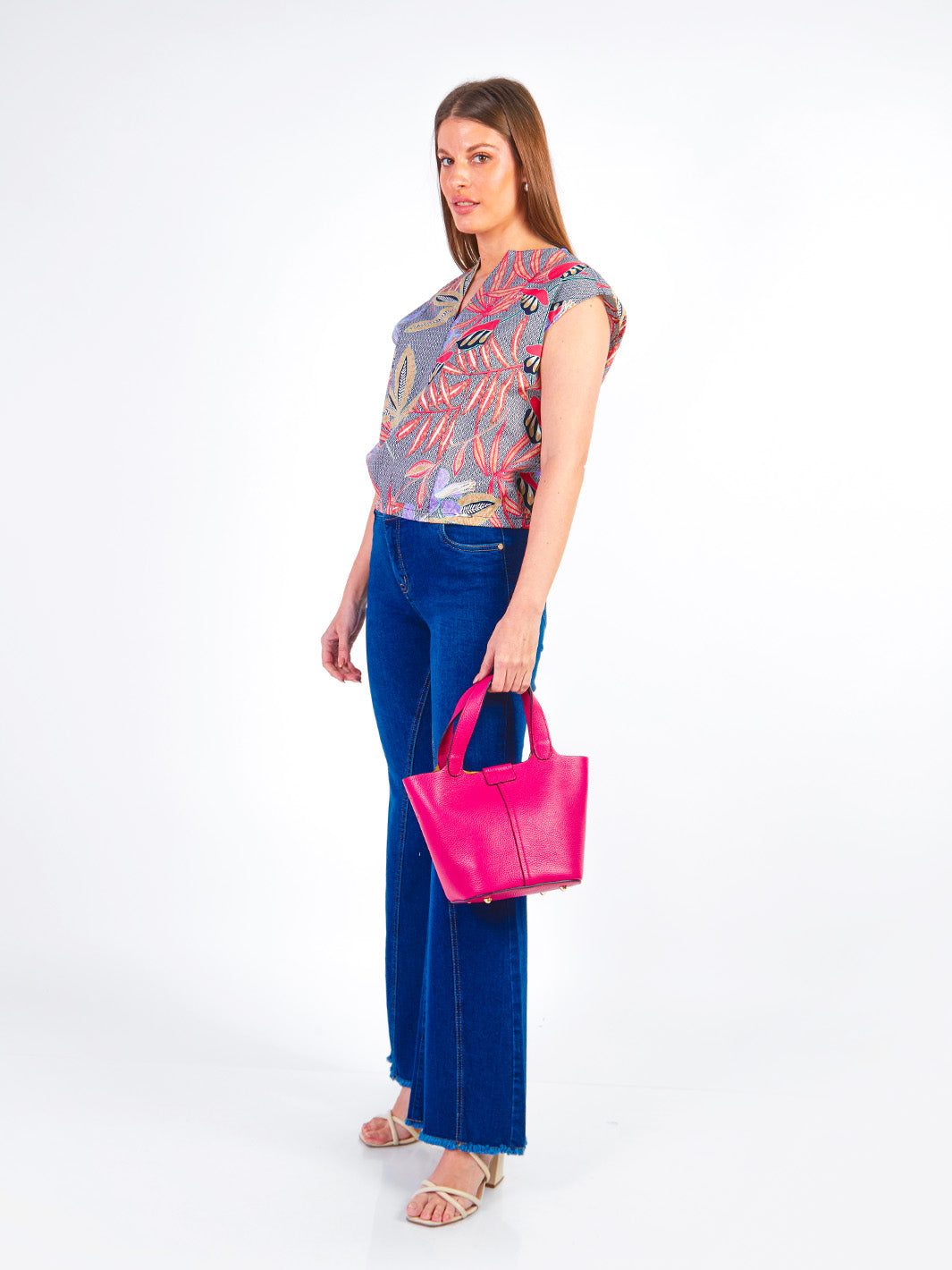 Esta blusa manga kimono es una pieza cómoda y femenina que destaca por su diseño relajado y moderno. Confeccionada en un tejido ligero y fluido, presenta un delicado escote ojal con un sutil escote en V al centro, que aporta un toque de sensualidad sin perder la elegancia. Su silueta amplia en las mangas tipo kimono brinda libertad de movimiento y un aire sofisticado, ideal para días cálidos o para usar como capa ligera. La pretina elasticada en la parte inferior ayuda a definir la figura sin comprometer la comodidad. Su estampado vibrante completa esta prenda versátil y encantadora, ideal para combinar con pantalones de corte recto o faldas fluidas.