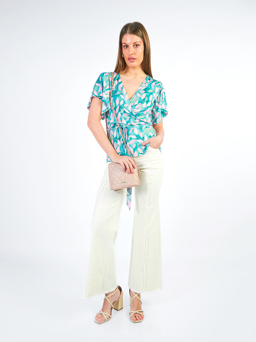 Este polo manga al codo destaca por su silueta envolvente y detalles cuidadosamente pensados que realzan la feminidad con sutileza. El escote en V cruzado favorece el cuello y el torso, mientras que los bobos en las mangas aportan un aire romántico y sofisticado. El cinturón a tono permite ajustar la prenda a la cintura, creando una figura estilizada y armoniosa. Su estampado de hojas en tonos acero o verde le da un toque fresco y natural, ideal para looks casuales con estilo. Una opción versátil y encantadora para elevar cualquier conjunto en tu armario.